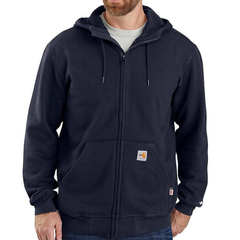 This men's full-zip sweatshirt is made of flame-resistant fleece for safety on the job. Sweat-wicking, quick-drying fabric keeps you cool and comfortable when conditions heat up. Original fit is Carhartt's most generous cut. 10.5-ounce, 40% cotton / 35% modacrylic / 15% viscose / 8% aramid / 2% antistat FR fleece. Meets the performance requirements of NFPA 70E and ASTM F1506. UL® classified to NFPA 2112. Built with Force technology to wick sweat and dry fast. FastDry® technology keeps you cool for all day comfort. Original fit. Attached three-piece hood with flame-resistant drawcord-adjustable closure; Vislon® front zip with Nomex® FR tape. Rib-knit cuffs and waist help keep out the cold. Locker loop for easy hanging. Carhartt FR and NFPA 2112 / CAT 3 labels sewn on pocket. Two front handwarmer pockets with inner media pocket. Imported FEATURES