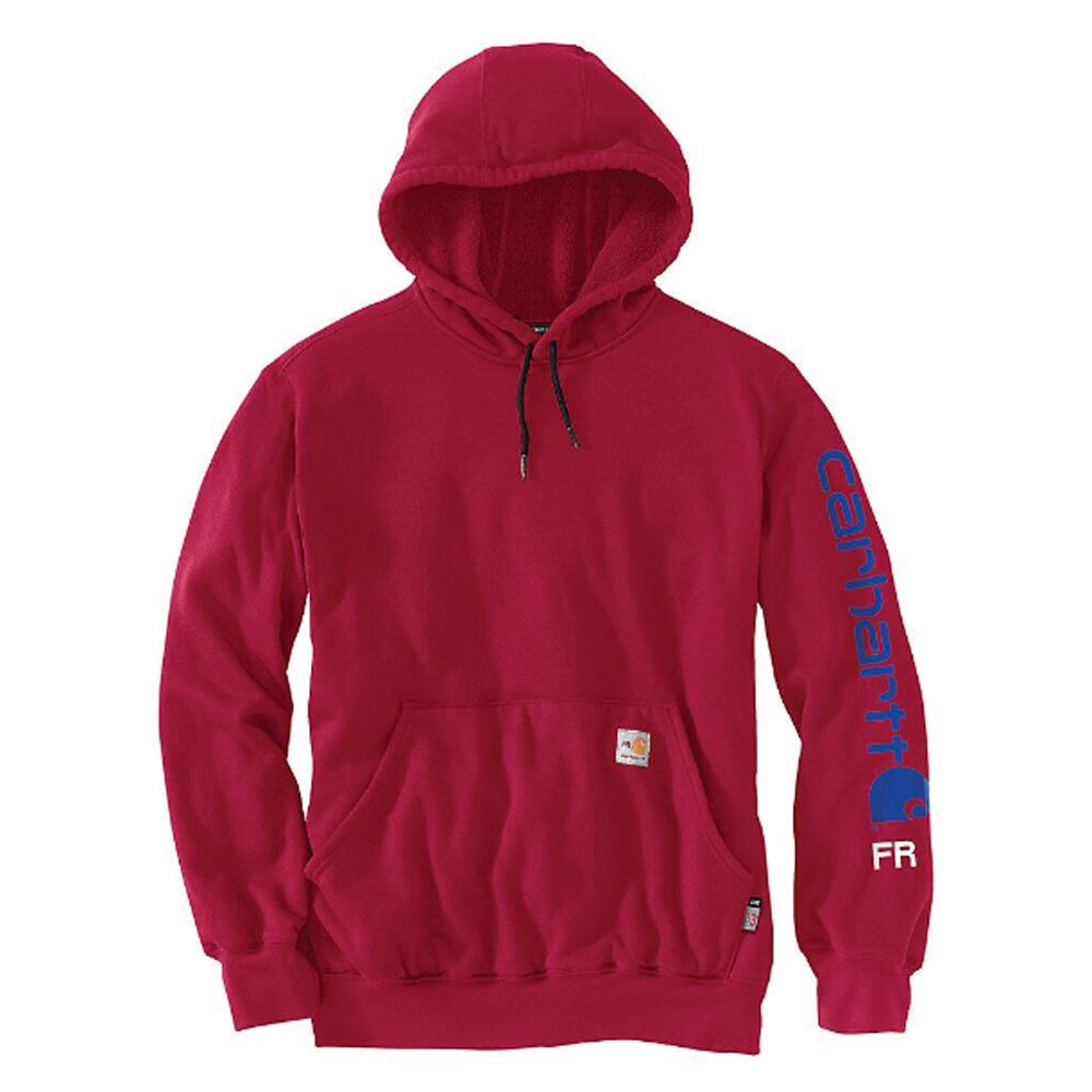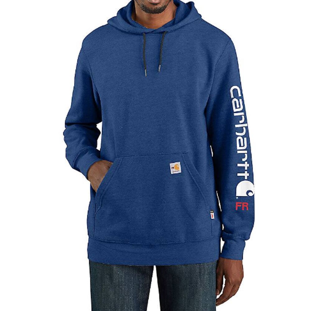 This men's sweatshirt is made to stand up under tough conditions. Flame-resistant fleece protects against dangerous arcs and flames. Sweat-wicking and quick-drying for comfort on long days at the job site. Original fit is Carhartt's roomiest. 10.5-ounce, 40% cotton / 35% modacrylic / 15% viscose / 8% aramid / 2% antistat FR fleece. Meets the performance requirements of NFPA 70E and ASTM F1506. UL® classified to NFPA 2112. Built with Force technology to wick sweat and dry fast. FastDry® technology keeps you cool for all day comfort. Original fit . Attached three-piece hood with flame-resistant drawcord-adjustable closure. Rib-knit cuffs and waist help keep out the cold. Locker loop for easy hanging. Carhartt FR and NFPA 2112 / CAT 3 labels sewn on pocket. Front handwarmer pocket with inner media pocket. Imported Features