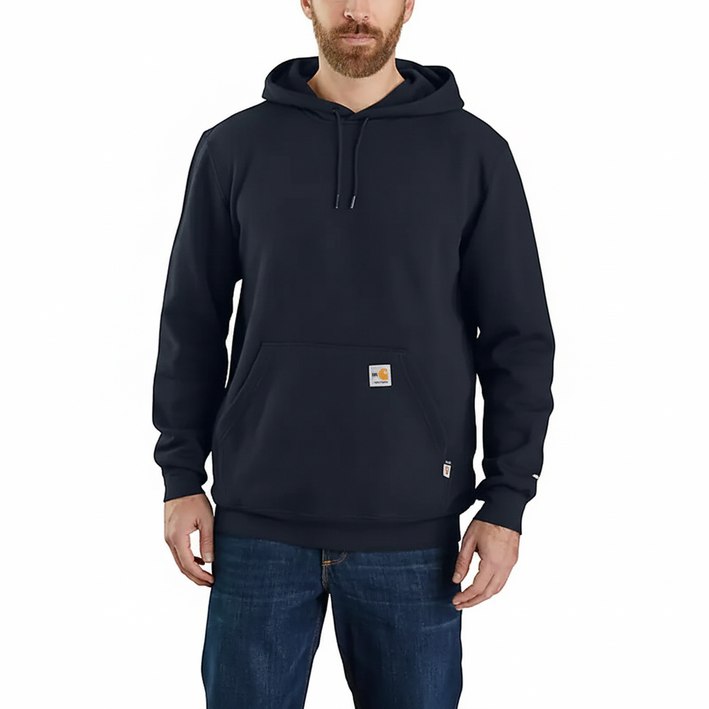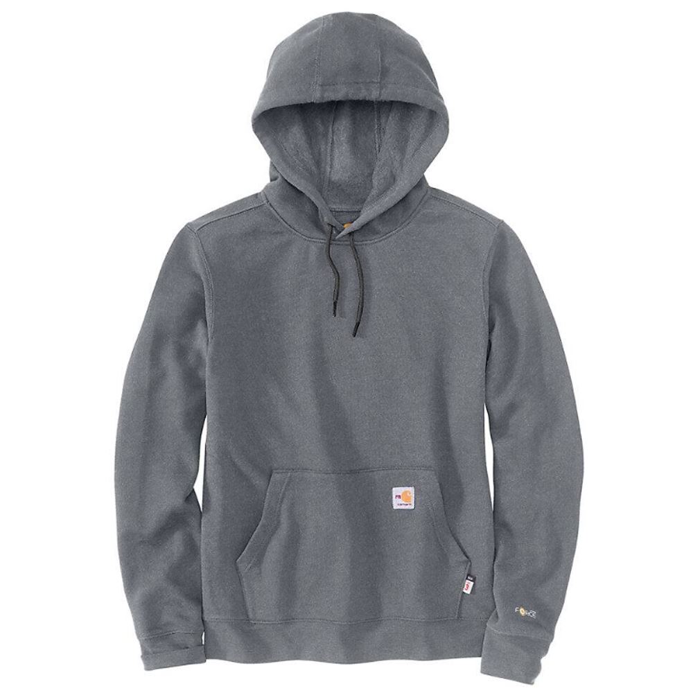 This men's sweatshirt is made to stand up under tough conditions. Flame-resistant fleece protects against dangerous arcs and flames. Sweat-wicking and quick-drying for comfort on long days at the job site. Original fit is Carhartt's roomiest. 10.5-ounce, 40% cotton / 35% modacrylic / 15% viscose / 8% aramid / 2% antistat FR fleece. Meets the performance requirements of NFPA 70E and ASTM F1506. UL® classified to NFPA 2112. Built with Force technology to wick sweat and dry fast. FastDry® technology keeps you cool for all day comfort. Original fit . Attached three-piece hood with flame-resistant drawcord-adjustable closure. Rib-knit cuffs and waist help keep out the cold. Locker loop for easy hanging. Carhartt FR and NFPA 2112 / CAT 3 labels sewn on pocket. Front handwarmer pocket with inner media pocket. Imported FEATURES