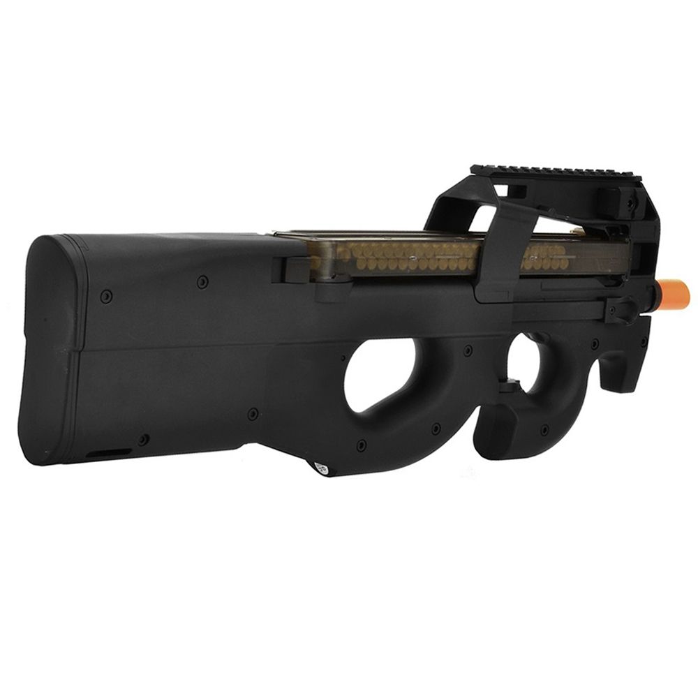 Move hard and fast through the CQB arena with the FN P90 Cybergun airsoft rifle! This AEG is an accurate replica of the iconic bullpup SMG including authentic FN Herstal trademarks. The unique PDW (personal defense weapon) design is ergonomic and compact, making it extremely agile and fully ambidextrous. It uses a custom top-loading magazine that’s semi-translucent with visible dummy rounds for added realism. The BAXS hop-up system makes it easy to dial in your aim and the tactical weaver/picatinny rail allows for optical attachment. The full metal gearbox and extended inner barrel make this a powerful and accurate rifle.