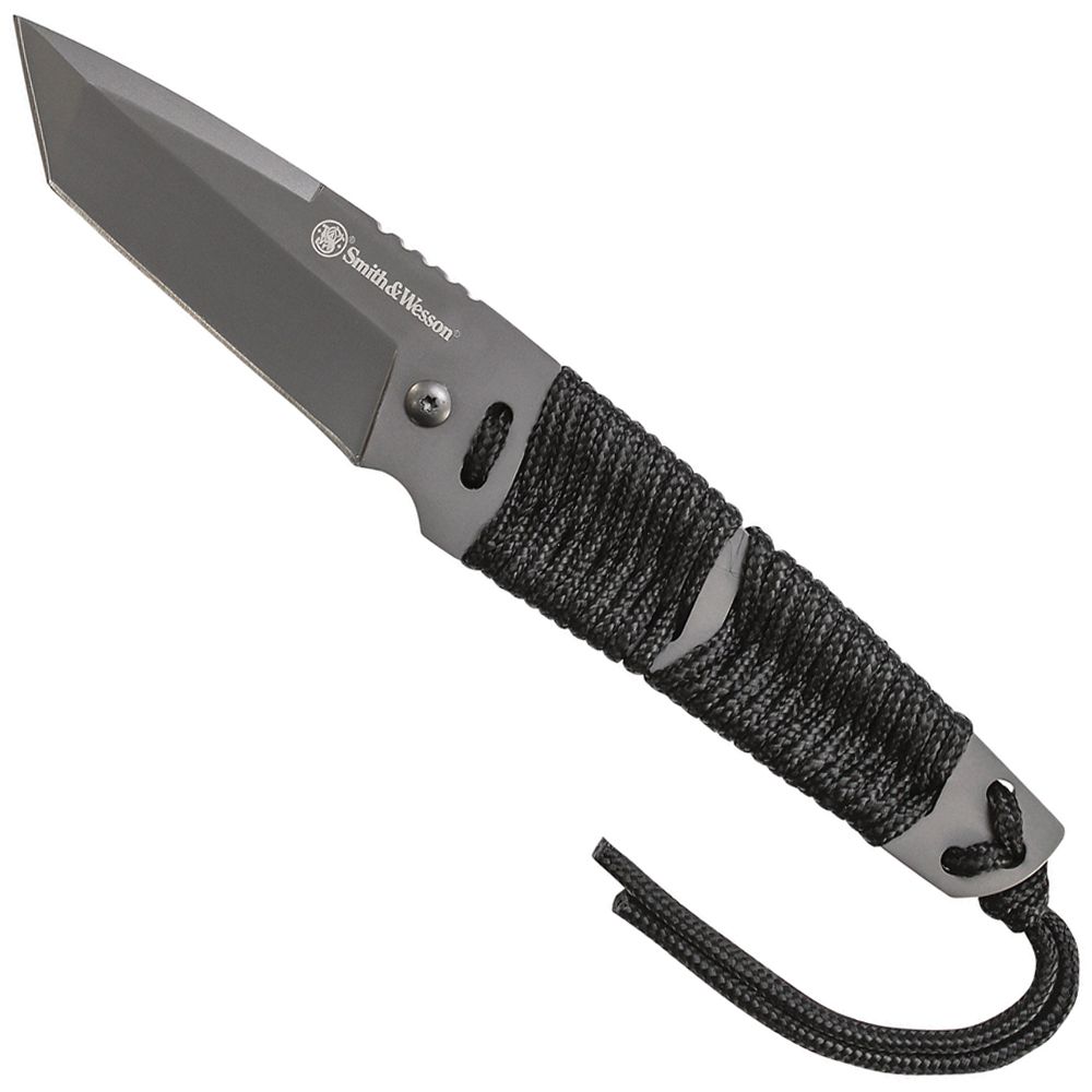 The Smith & Wesson Full Tang Fixed Blade Knife has a high carbon stainless steel tanto blade with spine jimping and a black paracord wrapped handle. Included is a lanyard, nylon fiber sheath cover and a pocket clip.