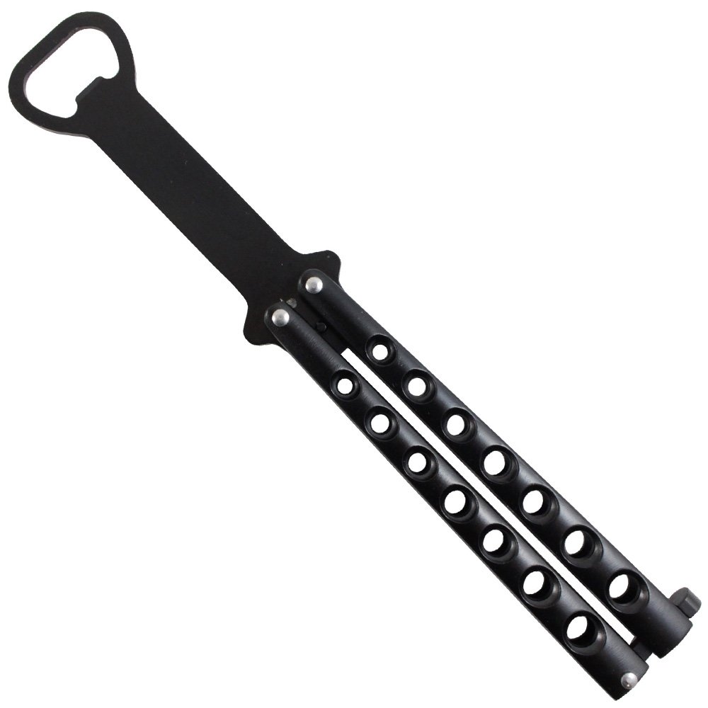 Bartending and balisong flipping go hand in hand with this Gear Stock butterfly knife bottle opener. This fully-functional balisong trainer has a full metal construction with a realistic weight and balance to practice your moves. Best of all, the blade has been replaced with a bottle opener, so you can crack open a cold one in the coolest way possible. This model features a matte black finish. Features: Edge Type: dull, Blade Material: metal, Overall Length: 208 mm (8.2 in), Blade Length: 87 mm (3.4 in), Handle Material: 121 mm (4.8 in), Blade Shape: bottle opener