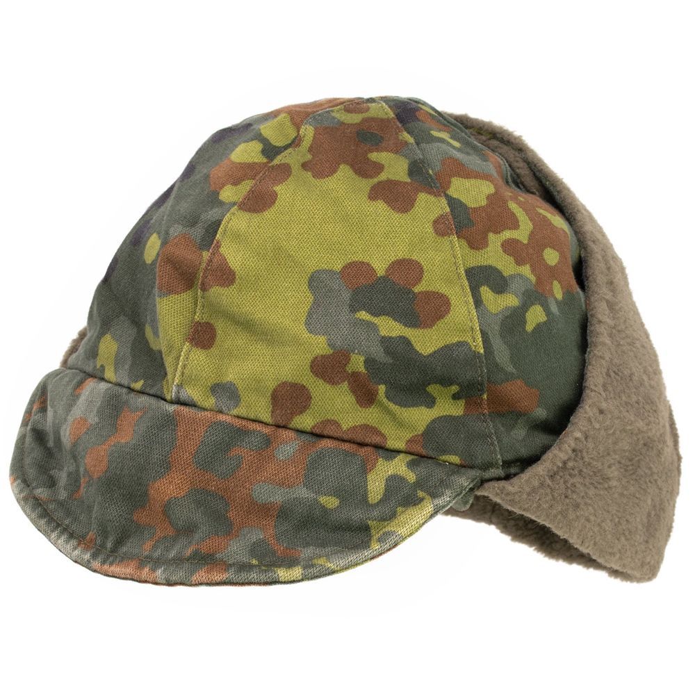 This used, authentic Military surplus German flecktarn camo winter cap is extremely durable and will keep your head warm. This hat features OD ear flaps that fold over the top of the hat and Velcro in place when not in use.Polyester / cotton blend