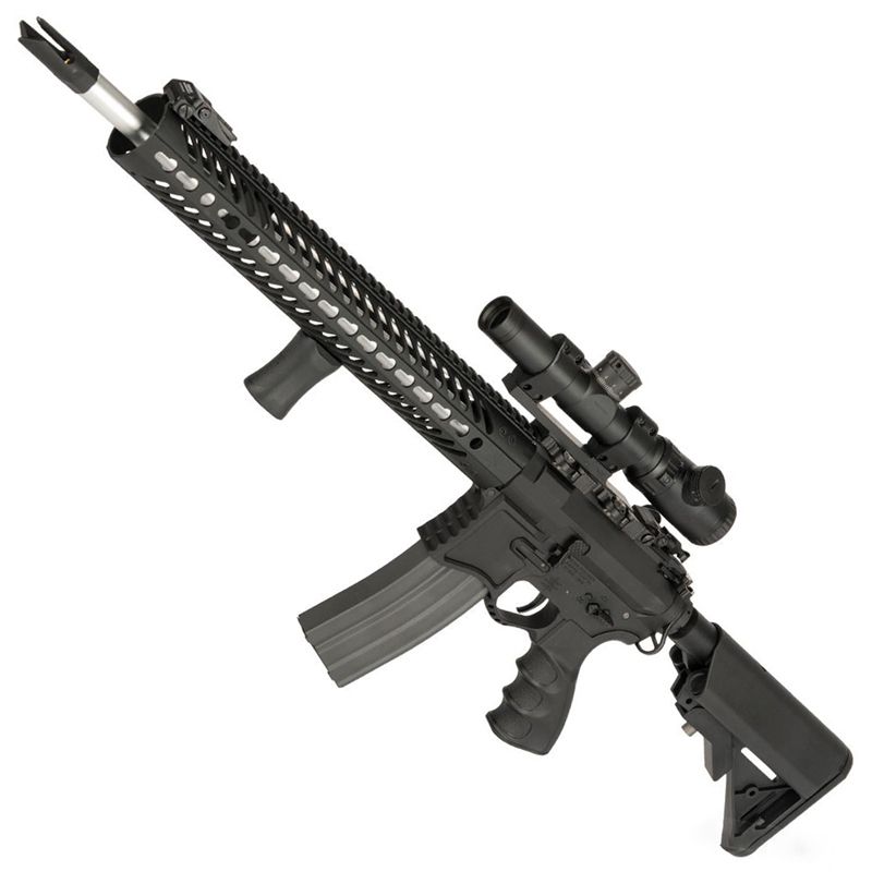 EMG has partnered with Seekins Precision and Airsoft manufacturing powerhouse G&G Armament to bring to the market, the first and only officially licensed Seekins Precision AR15 training AEG. EMG worked closely with the staff at Seekins to make sure that all the details, down to the finest markings were accurately reproduced in this full size AEG rifle. Like it's steel family member, the EMG Seekins receiver is CNC machined from a lightweight yet durable aluminum alloy, keeping weight down, but providing the user with the unmistakable feel of a Seekins Precision SP223 billet receiver. The forward portion of the EMG Seekins rifle features a perfect replica of the Seekins Precision SBR8 Keymod rail. Built 100% from the original blueprints, EMG's SBR8 rail is painstakingly machined from aluminum alloy to accurately reflect the weight and feel of the real thing. The SP223 is beautiful to look at and it never fails to deliver on the field. Nothing less than the best will do when it comes to the internals powering this monster of an AEG. Internally the Seekins / EMG SP223 is powered by an EMG specified G&G Top Tech gearbox. EMG worked with G&G Armament to make their already deadly Top Tech gearbox into something fitting of its Seekins Precision clothing. The gearbox cradled inside the receiver features 8mm bearings, polycarbonate piston with steel teeth, 16AWG wires and redesigned bevel gear to reduce heat spikes, an electronic microswitch trigger switch with a shock absorbing leaf spring, and G&Gs excellent programmable burst control G2 MOSFET with micro speaker to indicate burst control setup. All of these features ensure that the EMG Seekins SP223 will destroy the competition anywhere it goes.