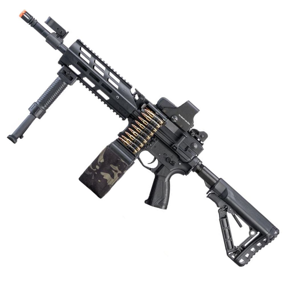 The G&G CM16 LMG Airsoft Machine Gun is a lightweight yet powerful support weapon designed for sustained fire and versatility on the battlefield. Featuring a polymer receiver and M-LOK compatible handguard, this airsoft LMG combines durability with maneuverability. Its integrated MOSFET and ETU enhance trigger response, while the 2500-round electric box magazine ensures continuous firepower.