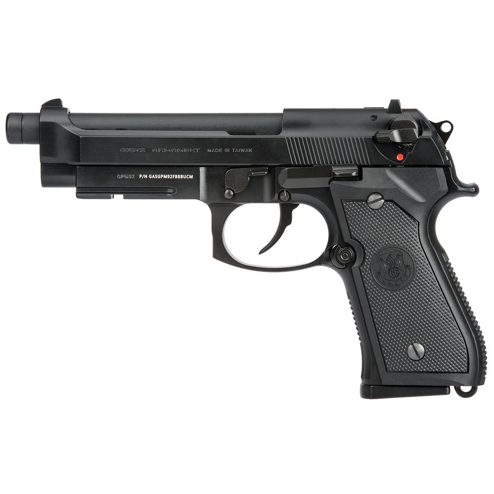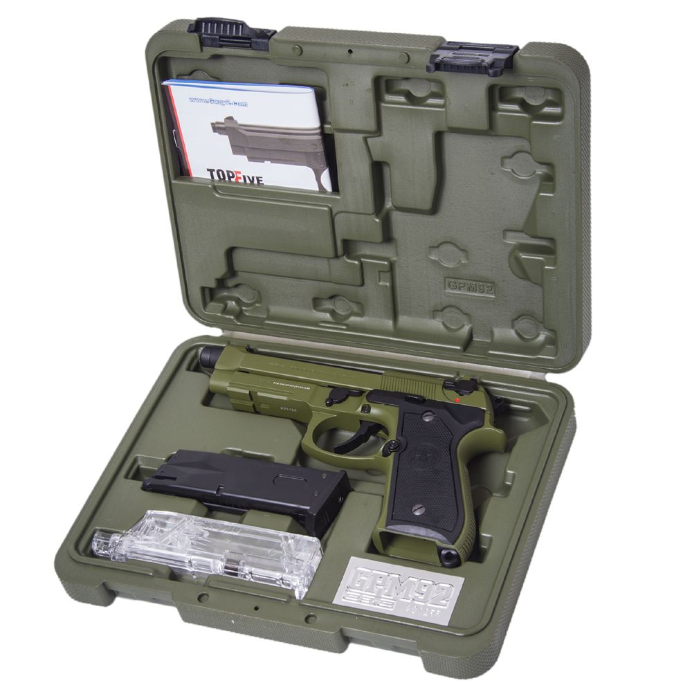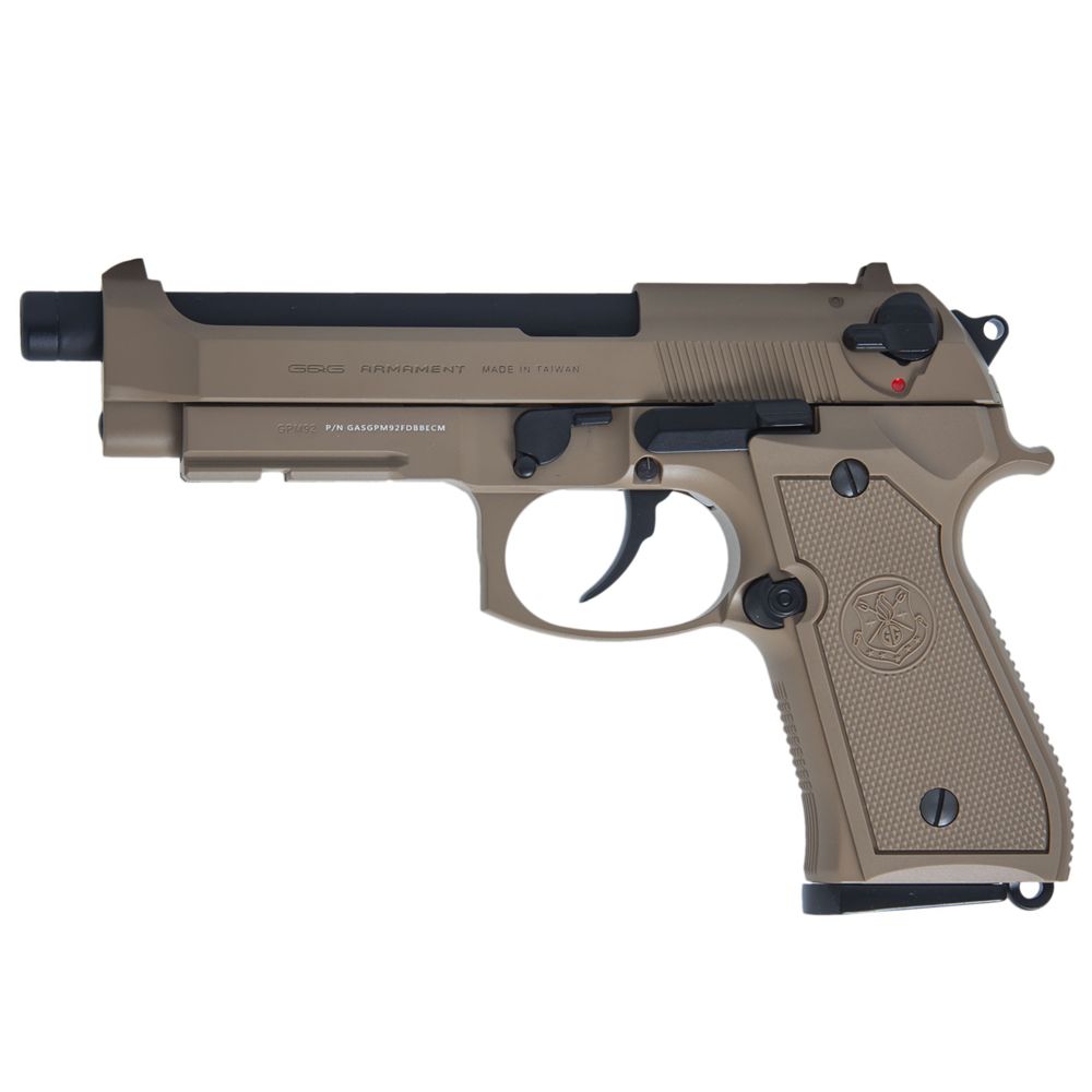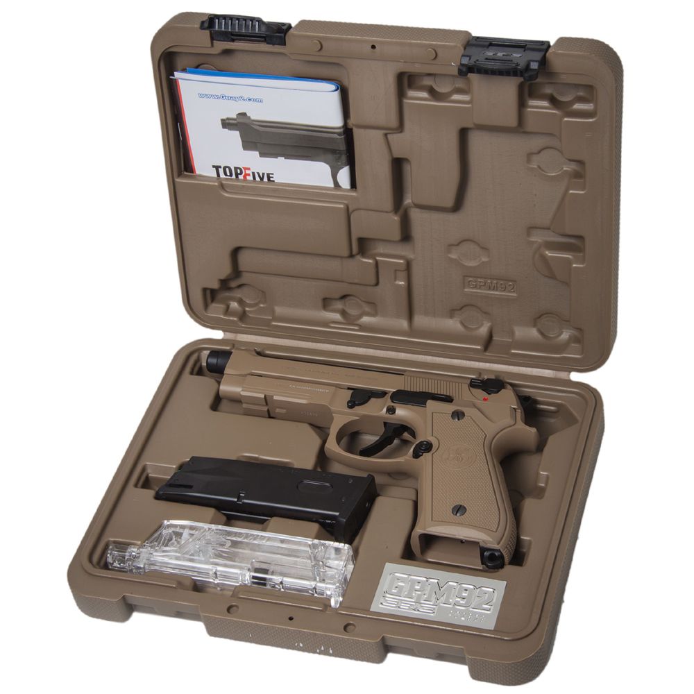 The GPM92 gas blowback airsoft pistol boasts some impressive hardware, inside and out. G&G’s all-new Whirl Cylinder Valve prevents frost build up from the green gas system, preserving firing speed and reliability. The drop out magazine has a micro gas filter that greatly improves fuel efficiency. A collapsible safety valve stops the gas chamber from rupturing in the event of accidental over-pressurizing. The full metal exterior is an open barrel design with a beavertail grip and official G&G trademarks. It can be upgraded with tactical accessories using the integrated 20mm rail and threaded outer barrel. The GPM92 comes with a 27 round magazine and BB loader, all housed in a custom hard-shell pistol case.