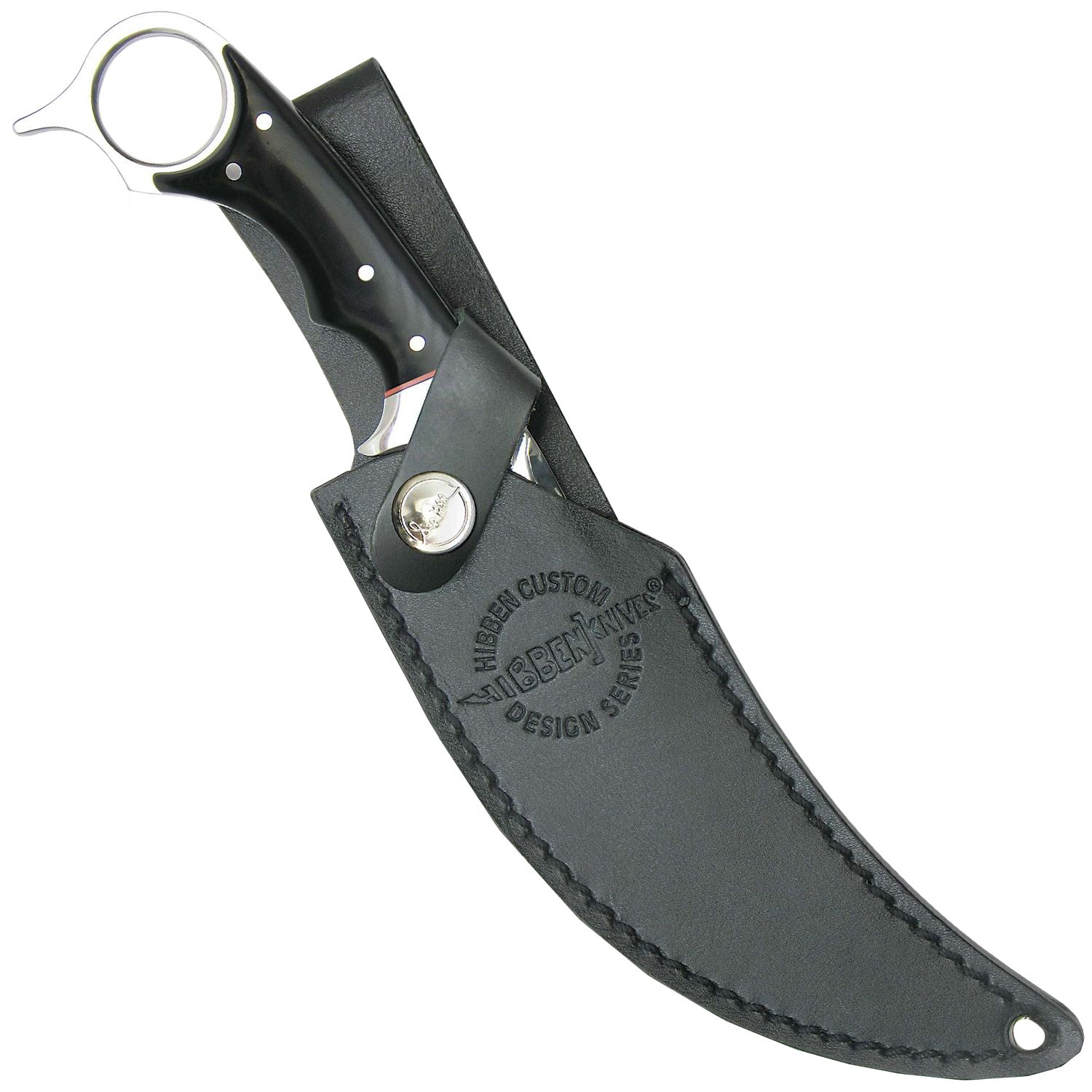 From its upwardly curved razor-sharp blade to its karambit style open-ring pommel with its wicked point, the Gil Hibben Recurve Karambit Knife is a fierce beast in a sleek package. The 6 1/4”, full-tang 5Cr15Mov stainless steel blade has a mirror polished finish that leads up to a hefty stainless steel bolster. The ergonomic, black linen Micarta handle scales are secured to the tang by steel pins and are accented by a red Micarta band. The 11 1/2” overall fixed blade knife fits securely in a leather belt sheath that has a snap closure handle strap and the Hibben logo.