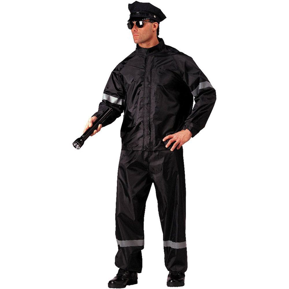 Hi-visibility reflective police 2-PC rainsuit is made of heavy duty oxford nylon. The black rain suit has polyurethane coating. The sealed seams of the rainsuit make it sturdy and water resistant. The suit is provided with microphone holder and badge tabs. The sleeve and the legs of the rainsuit have 1 ½ inches scotchlite tape which makes it more attractive. The zipper fly on the front side with hook and loop storm flap make sure that you are dry and warm on a rainy day. For easy access the side vents of the suit is provided with snaps. Elastic waist band and ventilated back are added feature which makes it comfortable and easy to wear.