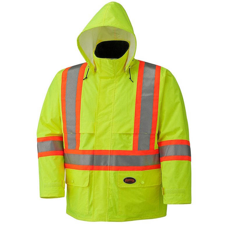 The Hi-Viz Waterproof Safety Jacket with Detachable Hood is made of a bright, weather resistant fabric with a reflective tape to protect against the elements and possible hazards. It's commonly used by traffic police, road workers, cyclists and those employed in ports, airports, rescue or emergency services.