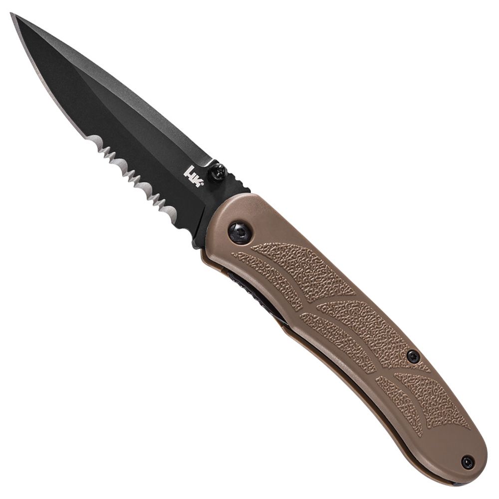 Stay a cut above the rest with the Heckler & Koch line from Benchmade. The P30 Combo Edge Knife is a tactical utility folder great to have on hand for any task. The blade may be small, but it is crafted from strong stainless steel and features a combo edge blade for making deep slices and cuts. Thermoplastic handle is moulded for a non-slip grip and comes in a desert sand colour. Folds out to 172 mm (6.75 inches) and comes with removable pocket clip.