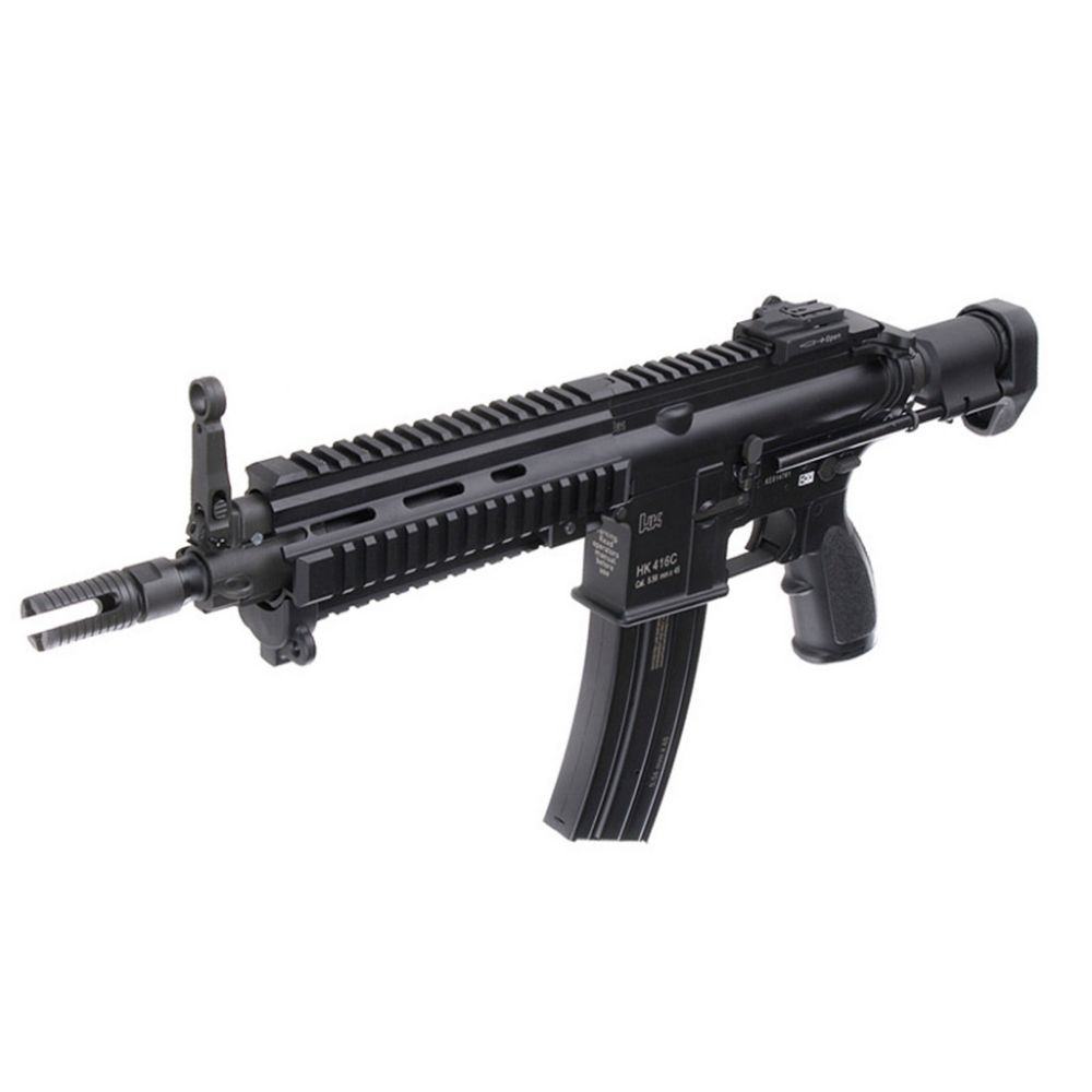 The HK 416 CQB is a licensed, authentic replica of the real 416 rifles used by military forces. The Metal receiver and high torque motor with metal gears and 8 mm bearings contribute to the elite status of the gun. The high-capacity, the 320-round magazine allows for lots of firing before the need to reload. The adjustable rear sight and adjustable stock allow for accurate and comfortable shooting. The metal-free float quad rail system lets you accessorize the gun to fit your individual specifications. Perfect for use on the mil-sim (military simulation) battlefield or in tactical training situations.