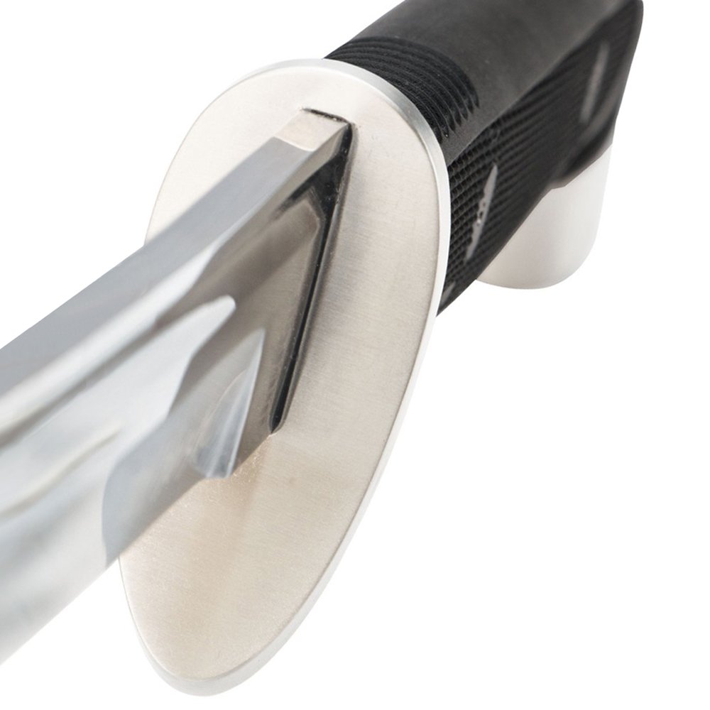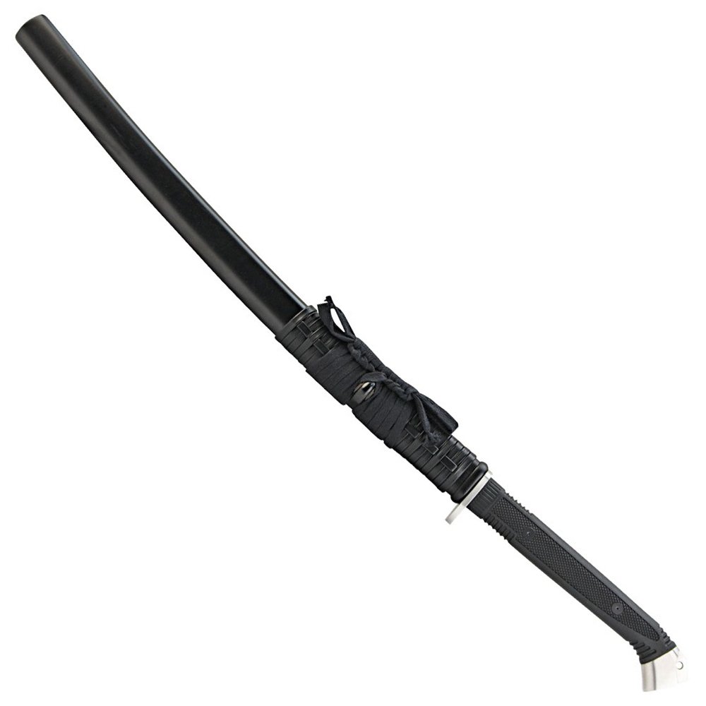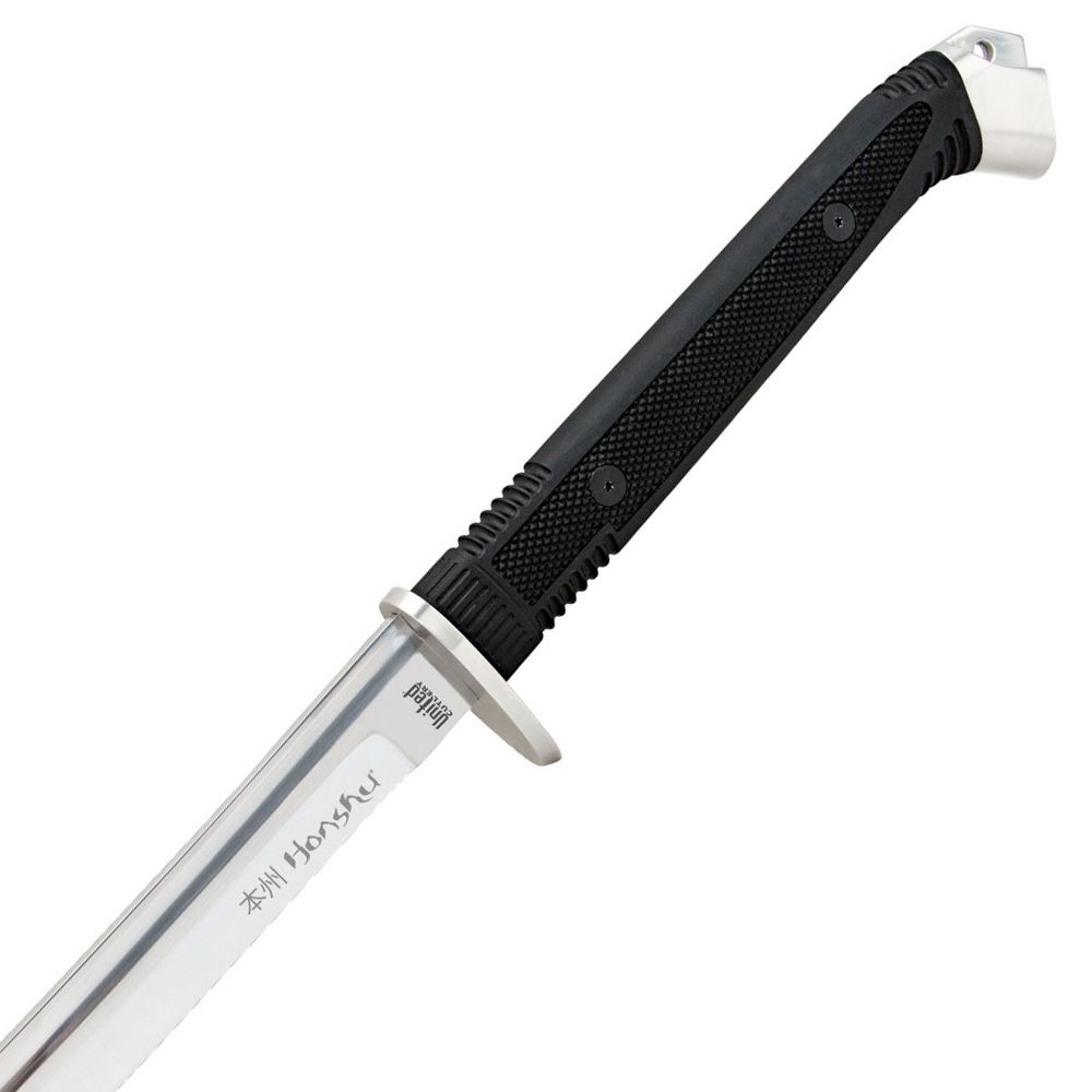 United's new Honshu Boshin Wakizashi has a sleek, modern elegance and a fierce, menacing bite. The incredibly sharp 22 1/2" 1060 high carbon steel blade features a gracefully subdued satin finish that beautifully complements the likewise-finished guard and pommel. The grip is molded from slip-free TPR for an impeccable feel and easy wielding. A wooden scabbard with handsome leather wrapping completes the package.