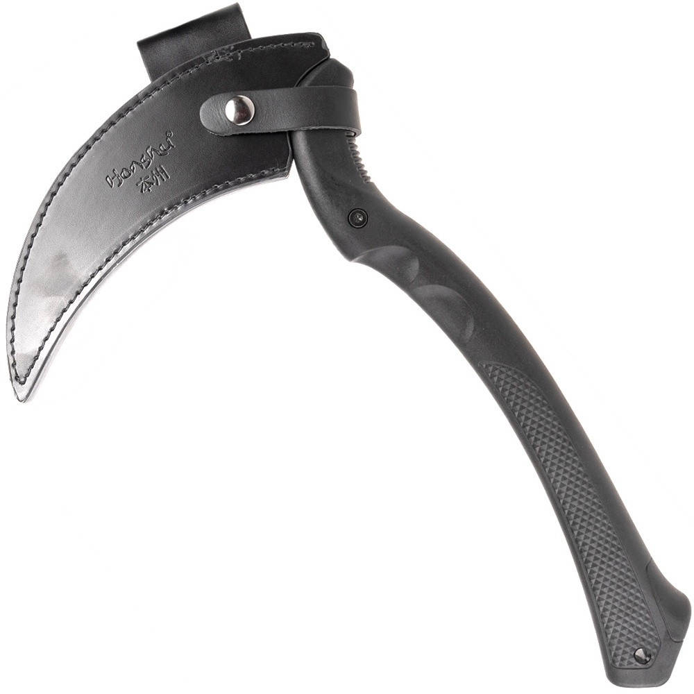 Based on a centuries old blade profile used during feudal era of Japan, this historical art is a must-add to your collection. It comes with a razor sharp curved steel blade with weight-reducing thru-holes to perfectly balance between functionality and the load the user has to bear in hand. The fully ergonomic Nylon handle is well-secured to the tang with heavy-duty screws and the finger grooves will also provide for a sure grip and effective handling even in the wettest situation. When it comes to transportation the black leather belt sheath solves it for you and for the fact that it features a snap closure strap makes deployment real easy and quick.