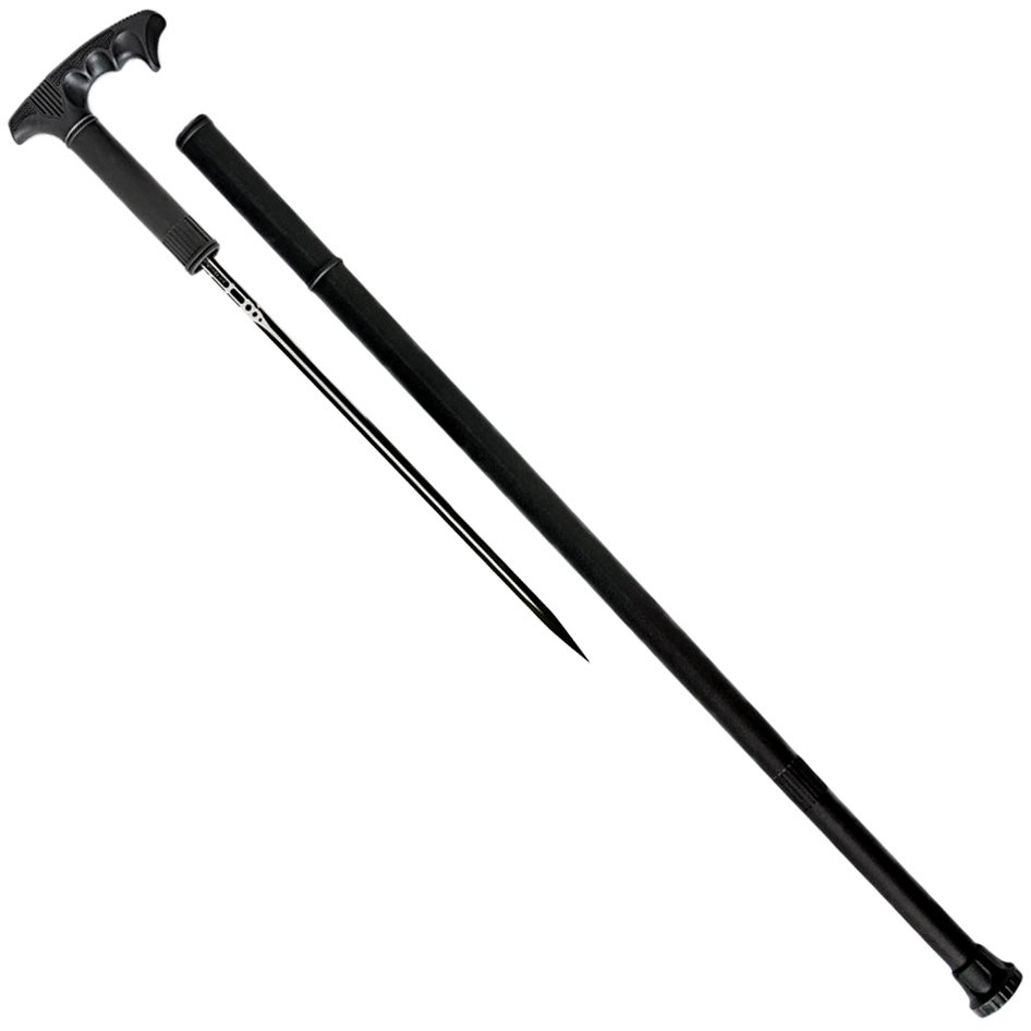 This heavy-duty sword cane is a beast when it comes to Law Enforcement! Features a lightning-fast blade draw. No clumsy unlocking buttons or unscrewing needed! The unique design features a tonfa-styled handle grip, the reverse of a normal walking cane. The handle is gripped underhand like a traditional Asian tonfa, creating a more secure non-slip hold for walking and allowing for a quick release and thrust-punch of the blade spike. The 16.75" blade is a solid spike of cast 2Cr13 stainless steel with a black oxide and satin finish. The cane shaft, handle, and grip are constructed of virtually indestructible fiberglass reinforced nylon, locked together with a rubber o-ring friction lock design.