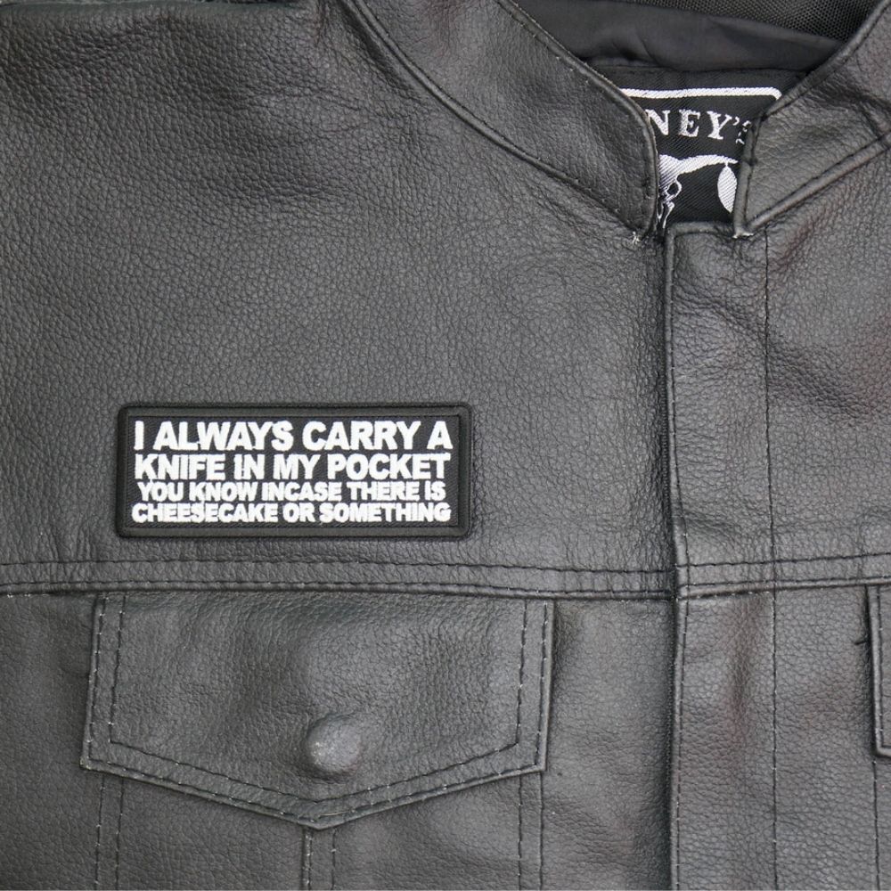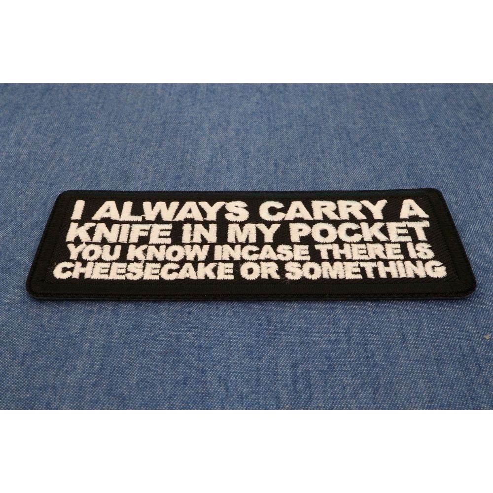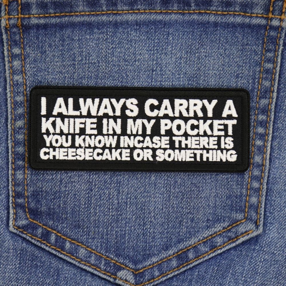 Add A Touch Of Humor To Your Wardrobe With The I Always Carry A Knife In My Pocket You Know In Case There Is Cheesecake Or Something Patch! Measuring 4x1.5 Inches, This Hilarious Embroidered Patch Comes In Classic Black And White, Making It A Perfect Accessory For Biker Jackets, Vests, Or Denim. With Durable Plastic Iron On Backing And Clean Laser Cut Borders, This Patch Can Be Easily Sewn Or Ironed On. For Best Results, Use A Heat Press At 270-290 Degrees Fahrenheit For A Secure Fit. Show Off Your Unique Sense Of Humor - Get Your Patch Today!