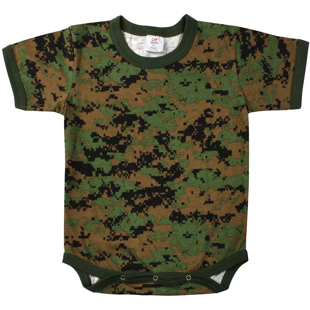 Infant Camo One Piece Bodysuit is designed for comfort and style. It is made from 100% cotton and hence it is extremely gentle on your baby’s skin. It features a snap bottom that allows you to dress the little one easily. The snap bottom also features brass and zinc plated buttons. It is available in different sizes. It is short-sleeved and has a round neck. It sports a lovely green colored lining on the neck, sleeves and on the snap-bottom. It also sports a white label on the inner side of the neck.