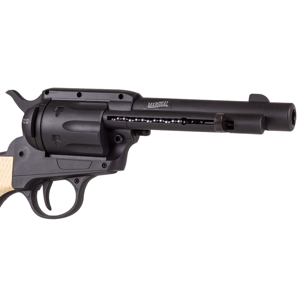 Crafted with a single-action trigger, the John Wayne Marshal revolver ensures a smooth and precise shooting experience. The grip removes easily to replace the CO2 cartridge, providing convenience and efficiency during reloads.