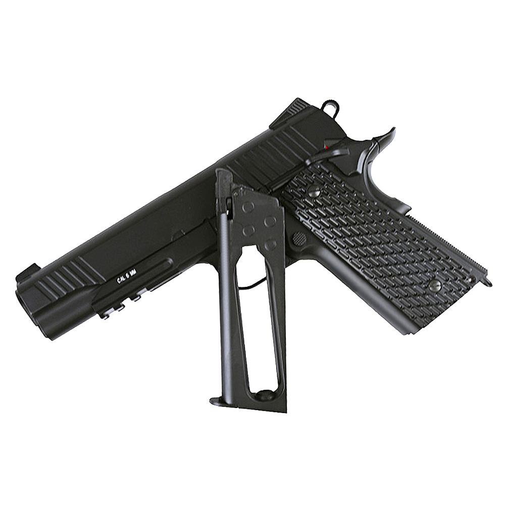 The 1911 platform is popular and common that its usage is well known and practiced by many players and easy to find holsters for and the pistol is all metal for great weight and feel. This gun is well put together and one of the best-made guns from KWC we have seen to date, and all the control latches and such are crisp and secure.The 17 round magazine feeds 6mm BBs and takes a 12g CO2 capsule for power; the capsule gives the weapon a VERY hard and loud crack when firing, a strong cycle action, and clocks 0.2g BBs at 390-400 FPS. Adjustable hop-up gives distance!