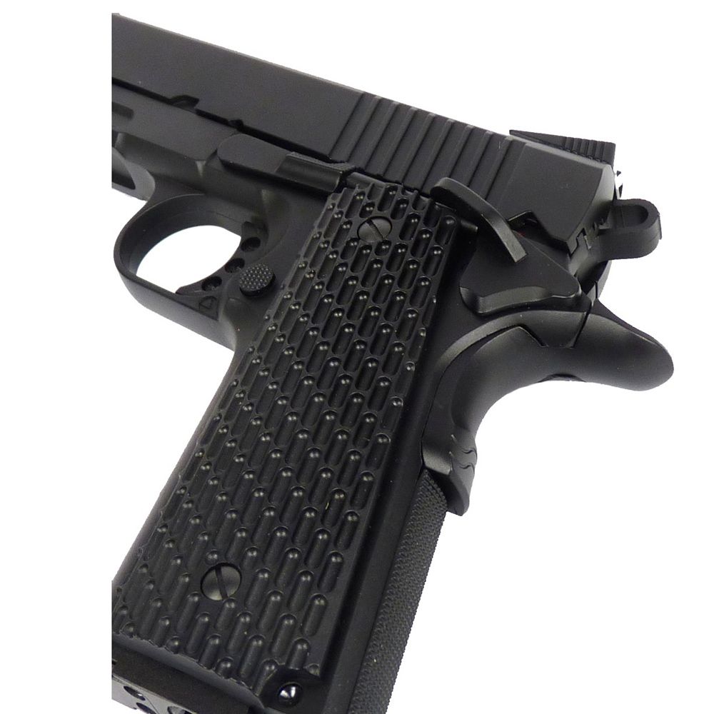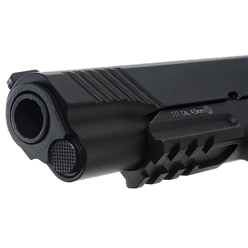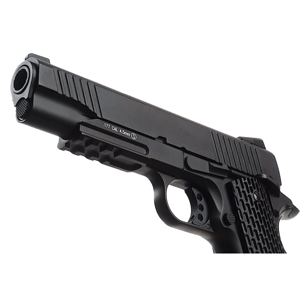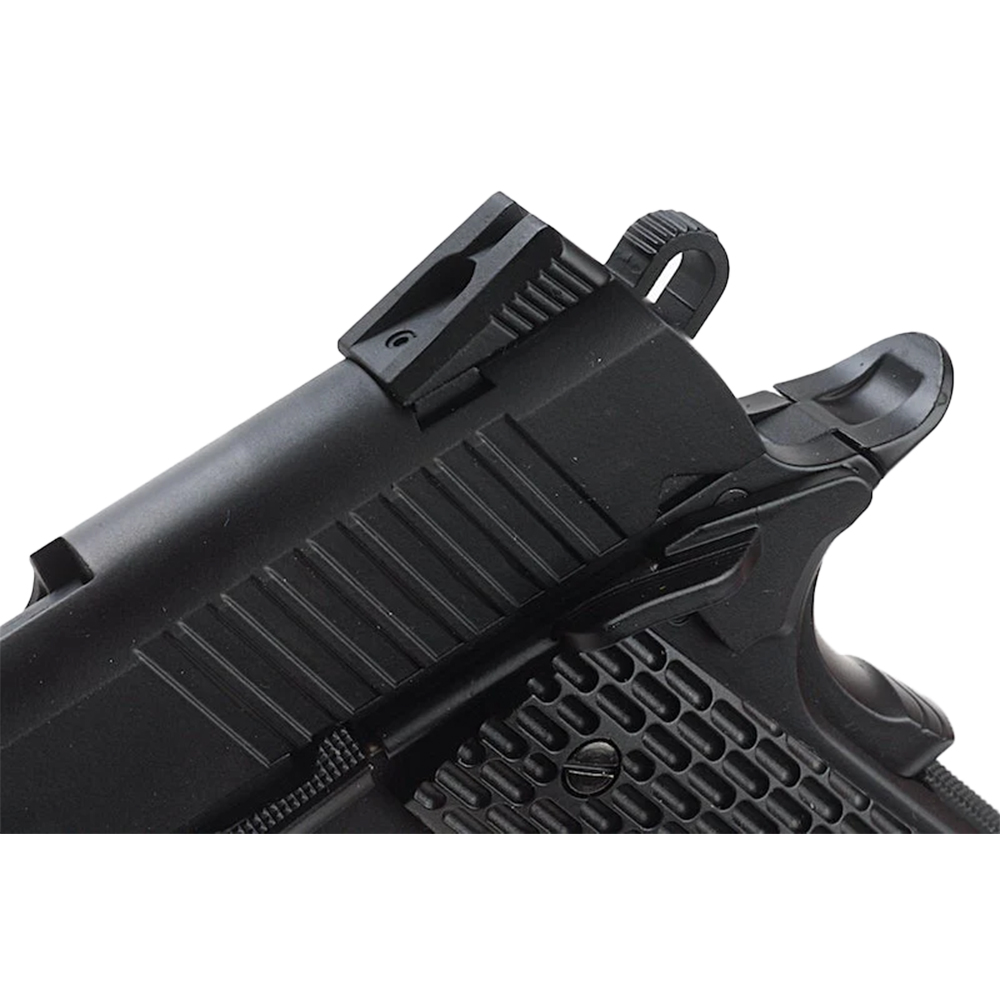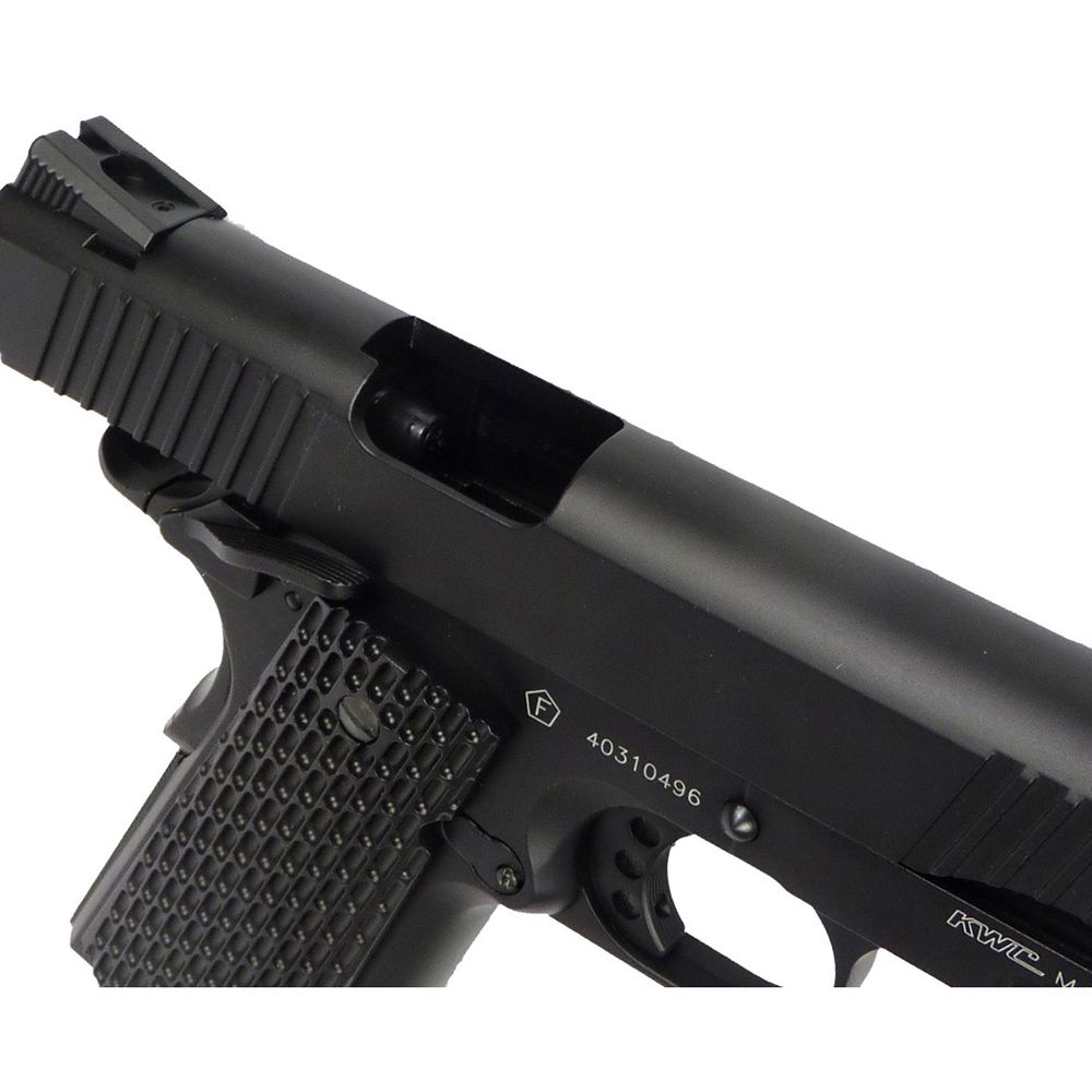 Τhis BB air pistol is styled after a real well known blowback pistol. This means it functions very similarly to the real steel. It is a very hefty gun made almost entirely from metal and has a very snappy blowback action which adds to its shooting realism. Even the magazine looks and feels like a real 9mm magazine with similar weight and dimensions. The KMB-77AHN of KWC shoots very accurately for a BB airgun and has fairly decent power considering its blowback function, though this does result in heavy usage of CO2.The only problem with the classic weapon is that it is missing a few of todays more modern features and that's what is so nice about the new KMB-77AHN of KWC BB Pistol, it takes an all ready great design and makes it even better by adding the Tactical style trigger and hammer, textured grips, ambidextrous safety, adjustable white dot sights and rail for add on accessories.