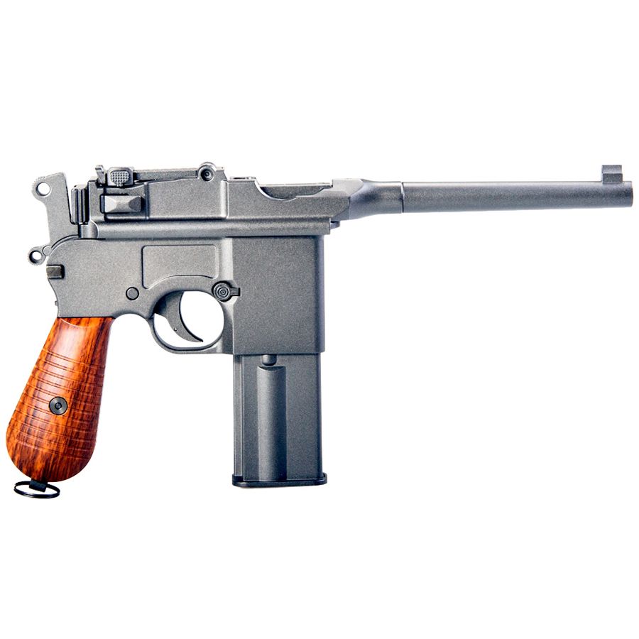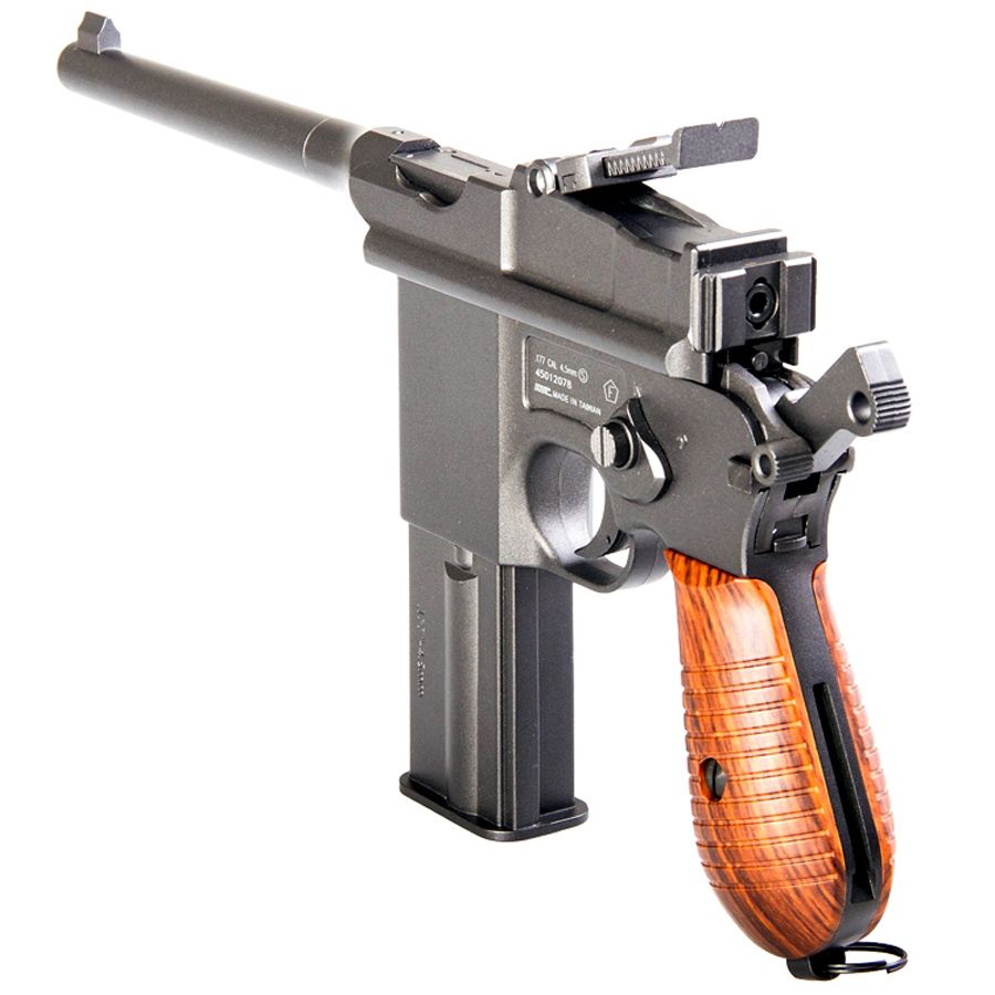 The KWC M712 is one solid pistol capable of shooting with speed and a kick that will shock you to your core. Modeled after the Mauser M712 Schnellfeuer, this pistol is authentically built with an all-metal construction including the adjustable rear sight, trigger, hammer, full size detachable magazine, safety, and magazine release. It also features a selectable semi-auto and full-auto functionality with snappy blowback action. Collectors know that this is a must-have of the classic World War II Broomhandle pistol.