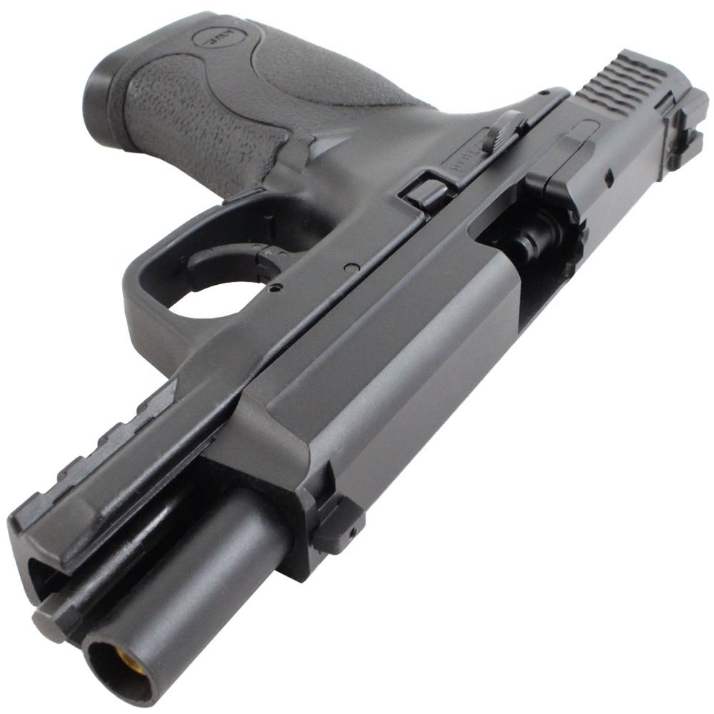 This CO2 airsoft pistol is a 1:1 scale replica of the Smith and Wesson M&P 40. Just like the real gun, its constructed with a light weight polymer frame for maneuverability. The metal slide has a realistic ejection port, through which the hop-up can be adjusted. This CO2 powered gun has a powerful blowback system and a slide stop that locks when the magazine runs dry. Other features include a 20mm weaver accessory rail, scalloped slide serrations, and field strip capability. The package includes three interchangeable palm segments to customize the grip.