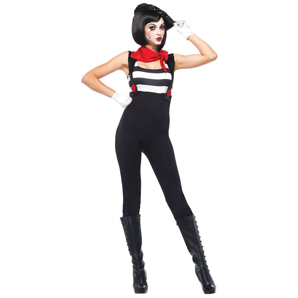 3 PC . Marvelous Mime, includes sequin suspender spandex catsuit with attached striped top, scarf, and sequin dot beret.