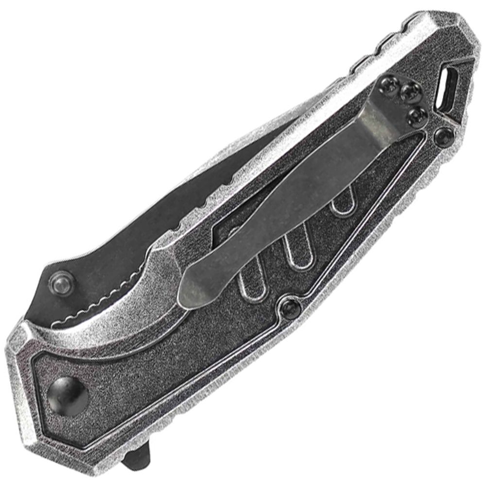 Schrade Liner Lock Folding Knife, Stone Washed 9Cr18MoV High Carbon Stainless Steel Clip Point Blade with Ambidextrous Thumb Knobs, Index Flipper, & Thumb Ramp, Stone Washed Aluminum & G-10 Handle with Thumb Rest Jimping, Lanyard Slot, and Pocket Clip.