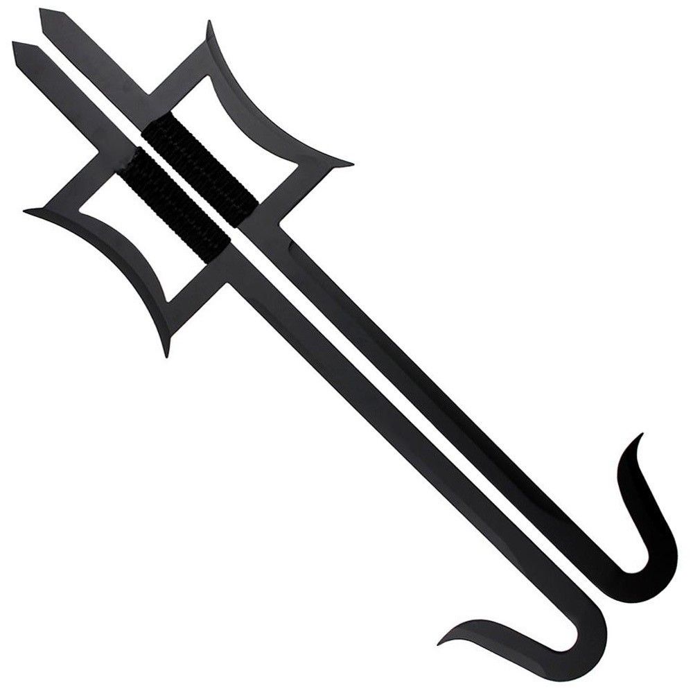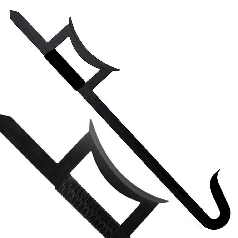These Chinese Hook Swords are multi-purpose weapons featuring multiple blade points on a flexible sword. The sword has a tactical look and an all black finish. The tight, cord wrapped handle keeps grip firm and supports the long blade.
