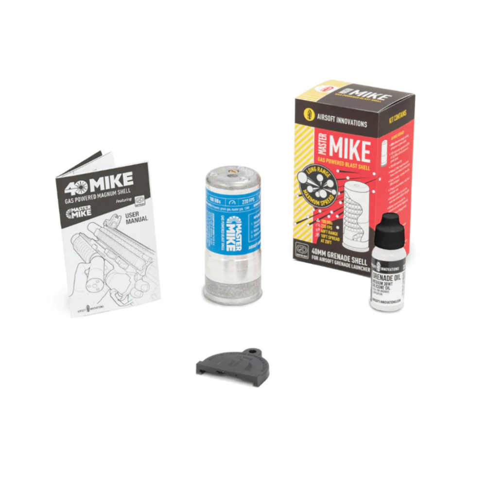 A practical updated rendition of the most powerful 40mm Airsoft shell to date, the new Master Mike has been exceptionally built for medium range engagements, boasting a 10 foot spread at 20 feet spread. It is capable of launching 100 BBs in 1/3rd fraction of a second at an amazing 220 fps speed with a jaw-dropping consistency, instantly qualifying it as the most effective medium-range gas powered blast shell in the world!