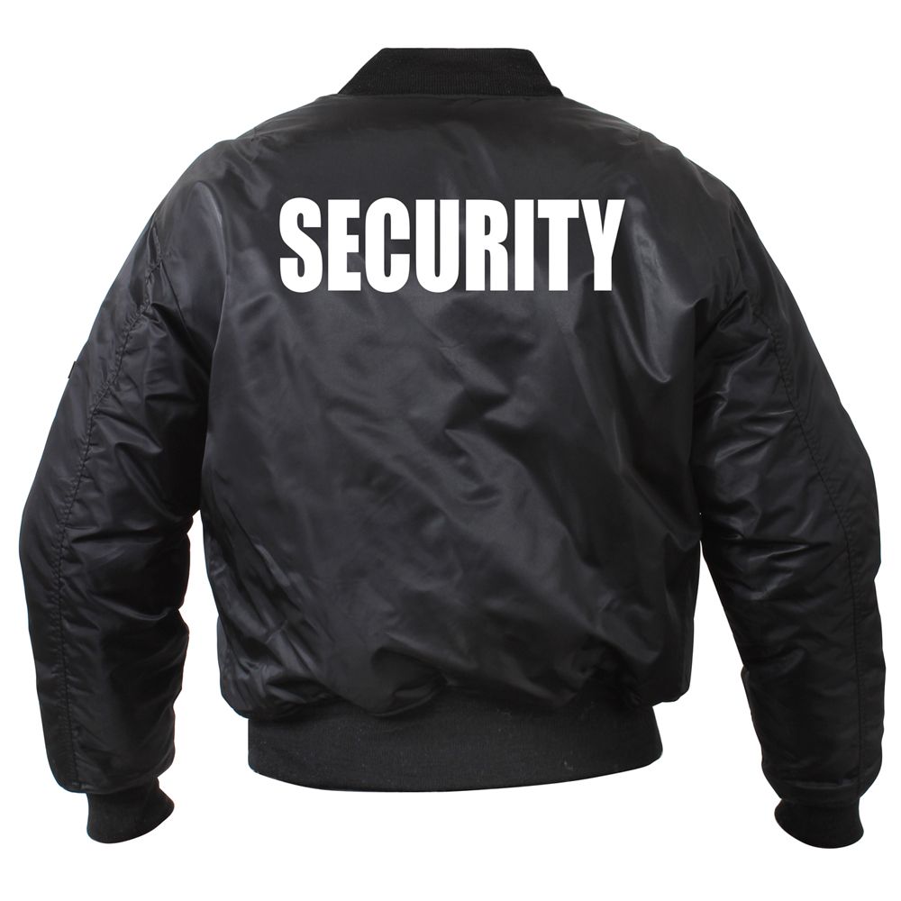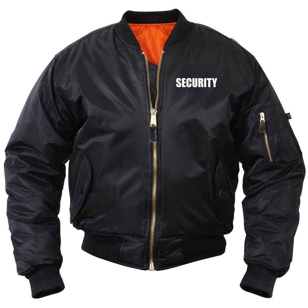 The Security MA-1 Flight Jacket is a total sporty looking brand new jacket. it is made from cotton fabric with reversible orange lining. It has incredible features, to make a man look cool, stylish and elegant. This jacket is based to be a replica of the original jackets used by the United States Air Force. The jacket has a 100% Nylon outer shell. It has a poly fiberfill to keep you warm and comfortable. It has a two way zipper to make wearing and removing comfortable. It also has the word "SECURITY" printed across the back and on the upper right hand chest area. The jacket is available in six sizes and can be ordered online.