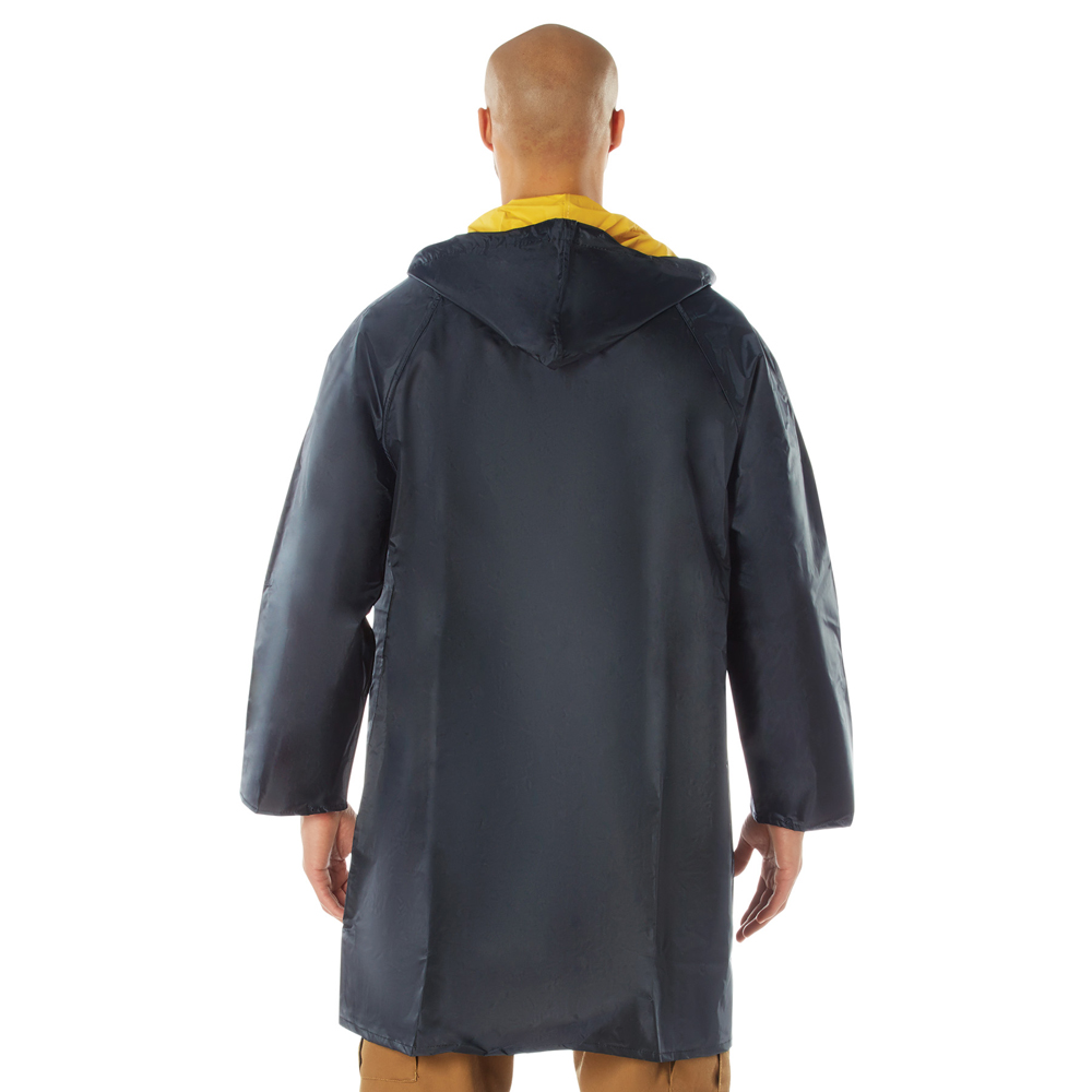 Reversible Navy Blue Yellow 3 4 Length Rain Parka is made of rubberized nylon which makes it durable and sturdy. The parka is two sided, navy blue on one side and yellow on the reverse. The 3/4 length parka is perfect to cover your body on a rainy day. It is easy and comfortable to wear as it has full length cut. The parka features zipper fly front and air vent underarms. The hood is attached to parka to keep your head dry when you go out in rain. It is completely water proof. The two flap pockets on the front side with metal snap allow keeping all your gears.