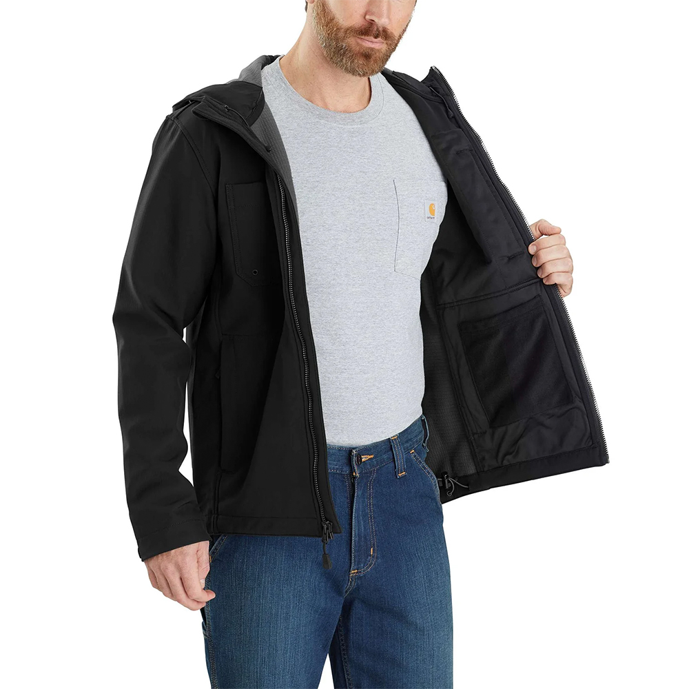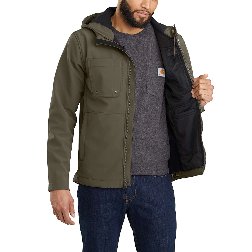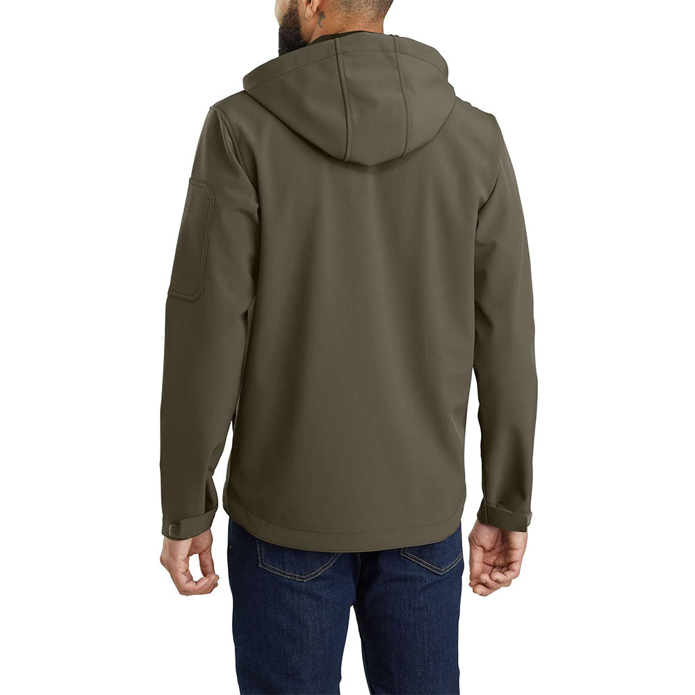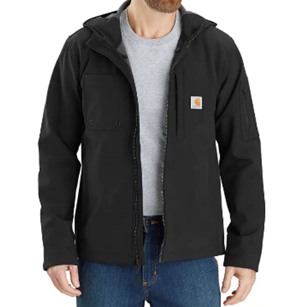 Wind and light rain are no match for this men's soft-shell jacket. It's made of grid-textured fleece bonded to a stretch-fabric shell for extra warmth. An adjustable hood provides extra protection from the weather. The midweight layer can be worn under or over another jacket.