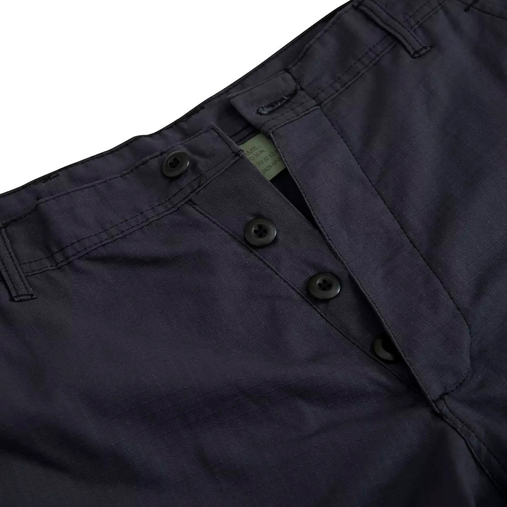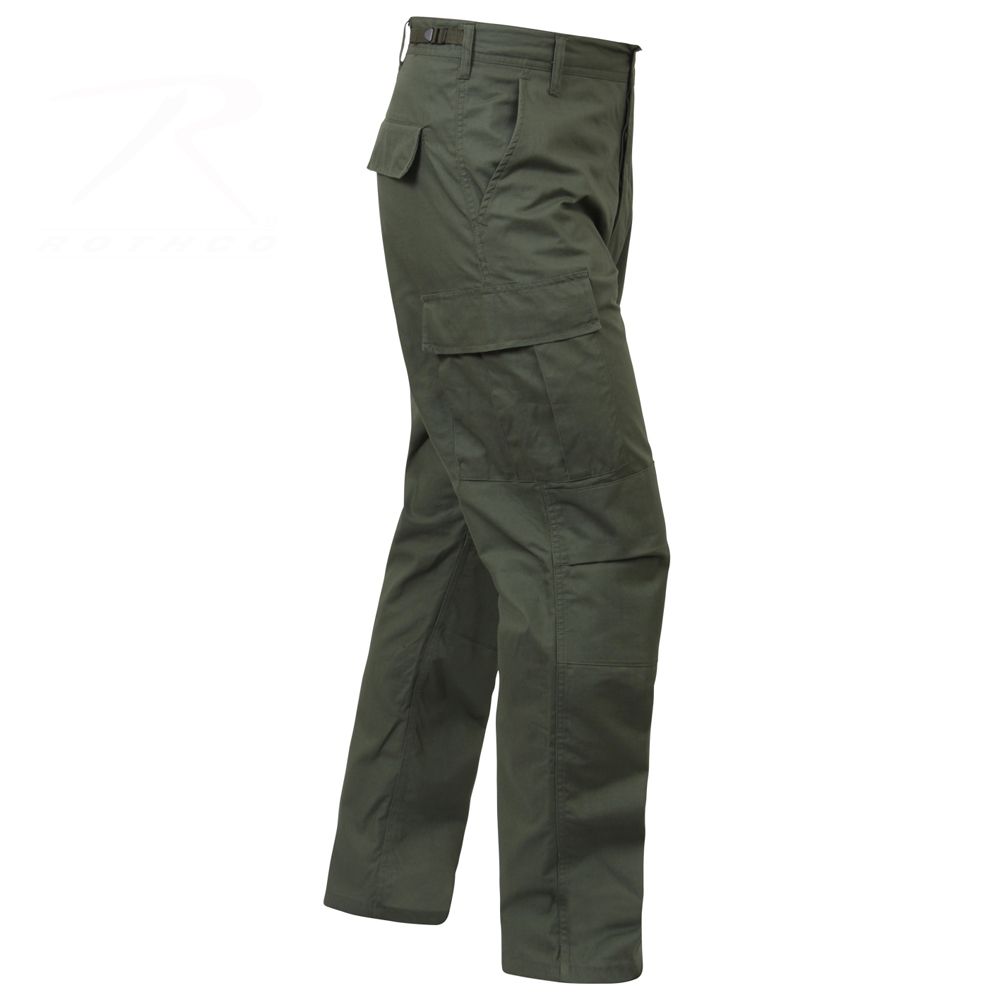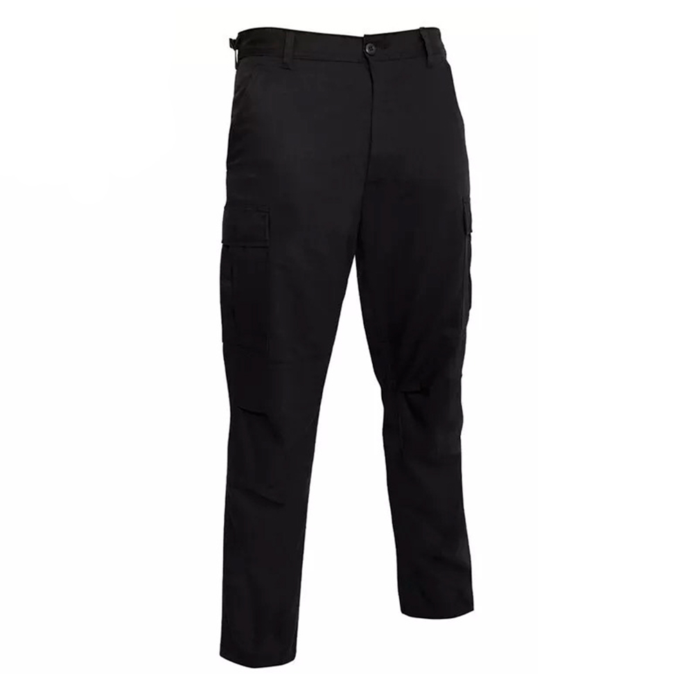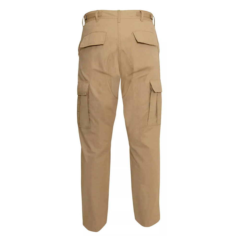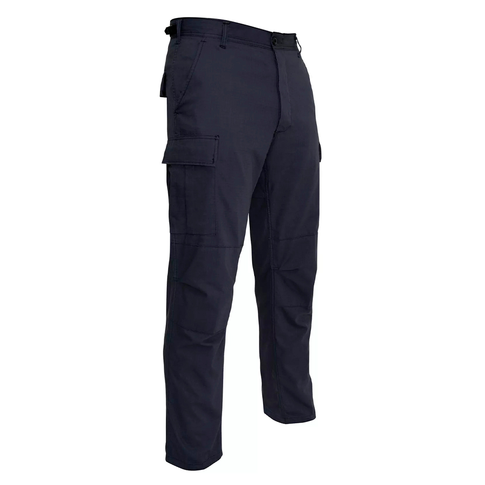 Rip Stop BDU Pants feature adjustable waist tabs, reinforced seat and knees, two cargo pockets, two button-down pockets, two front slash pockets, button fly and drawstring bottoms.