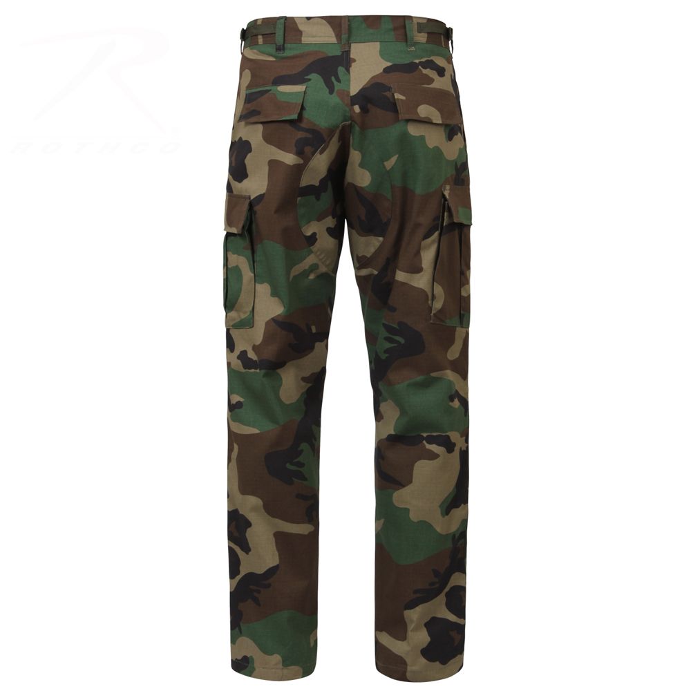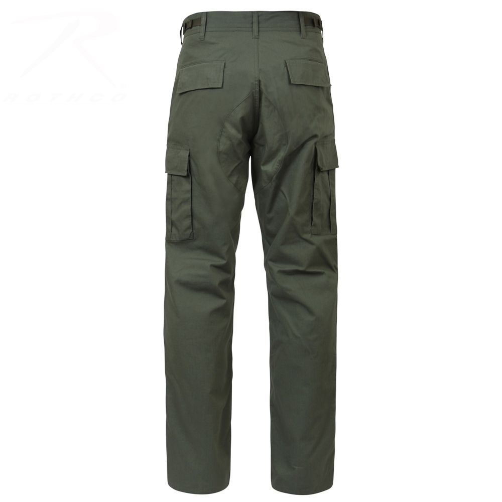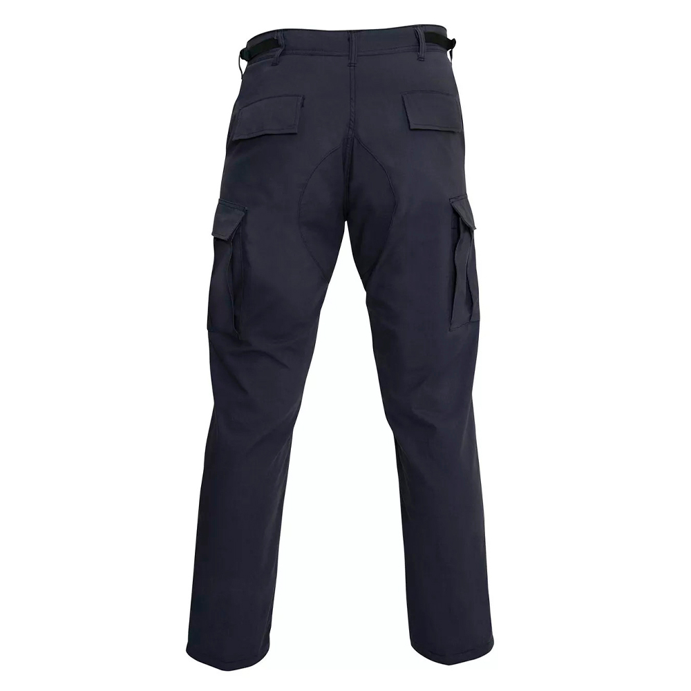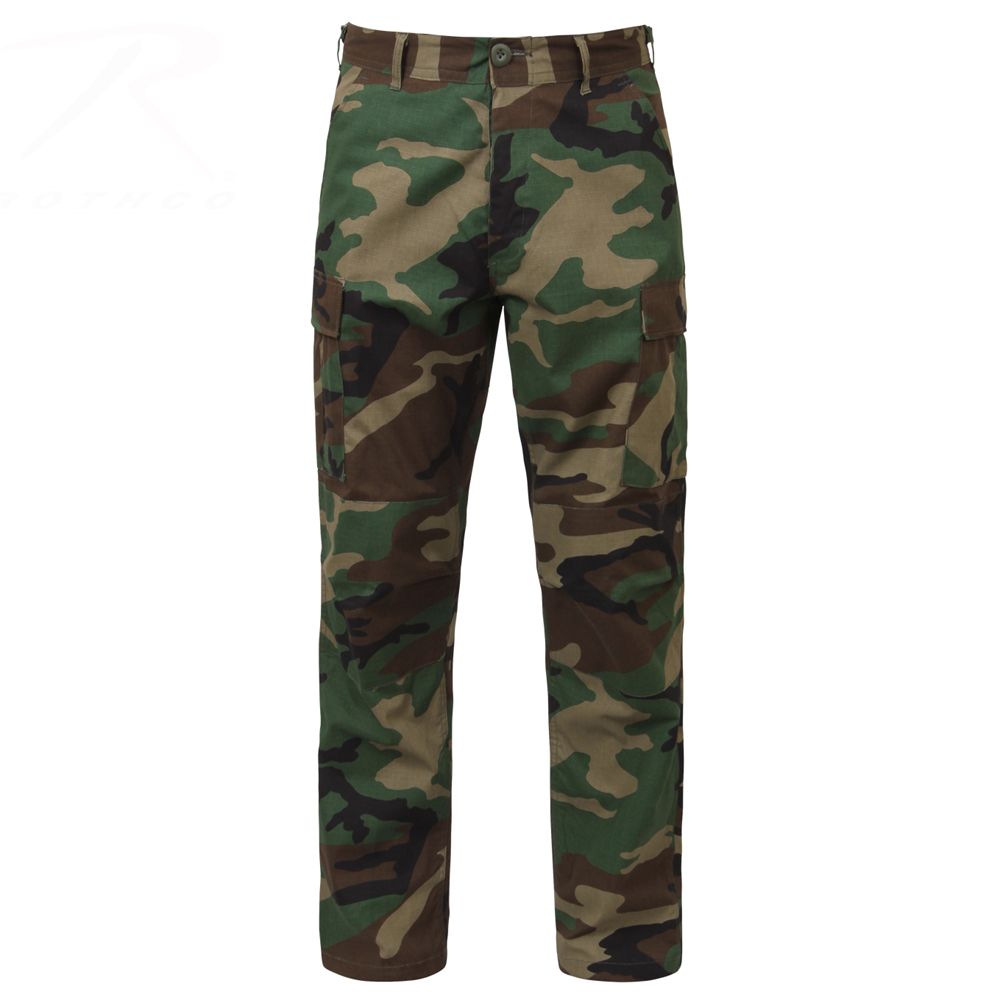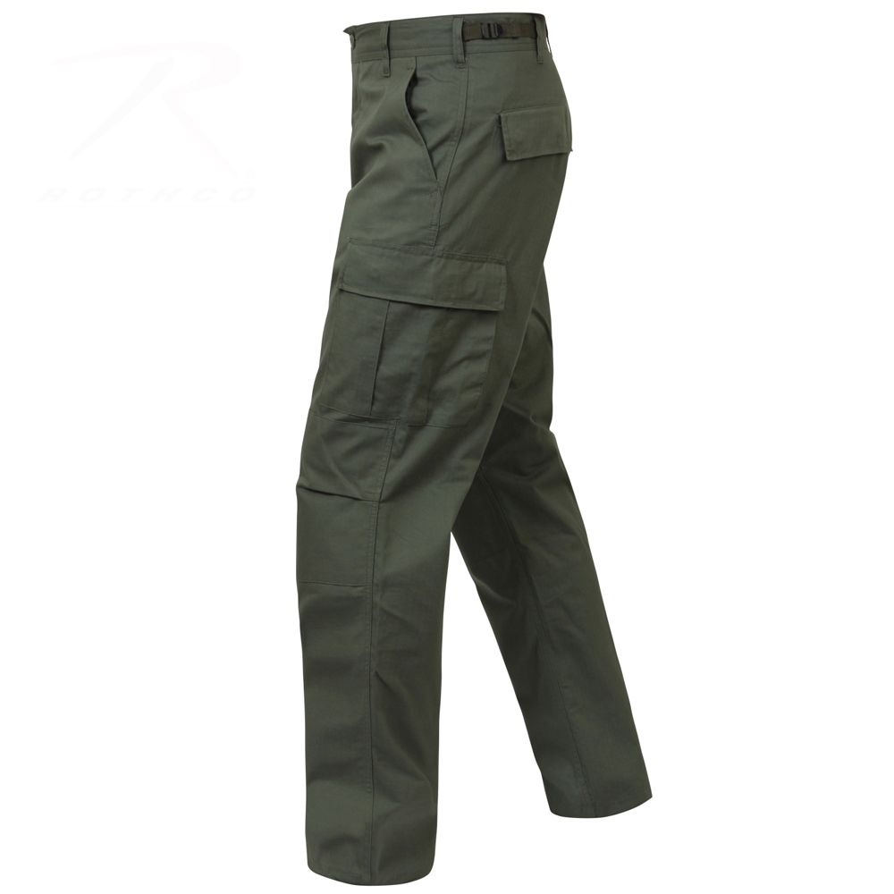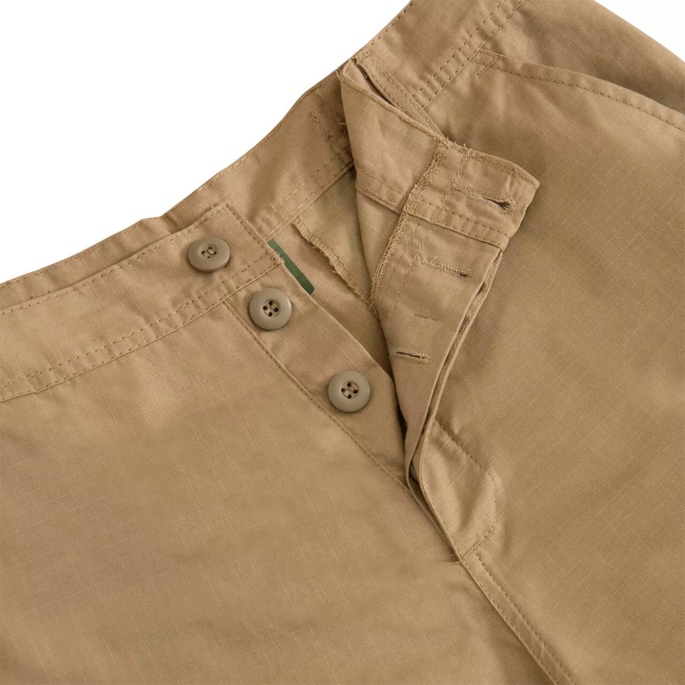 Rip Stop BDU Pants feature adjustable waist tabs, reinforced seat and knees, two cargo pockets, two button-down pockets, two front slash pockets, button fly and drawstring bottoms.