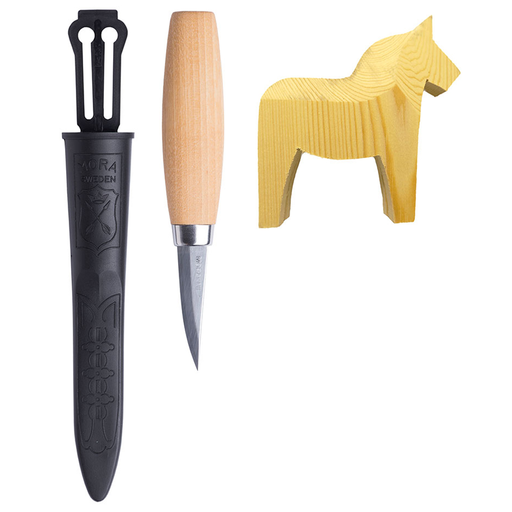 This traditional Swedish wood carving kit is a great introductory project for first time whittlers. The Morakniv 120 Carving Knife has a large birch wood handle and a thin tapered blade that provides exquisite control. Crafted from high carbon steel with a flat ground edge, this blade is an incredible detail cutter. Included with the knife is a rough cut wooden Dala horse ready to be carved to a smooth finish. The package also includes a a decorative rubber belt sheath for comfortable carry while working on projects.