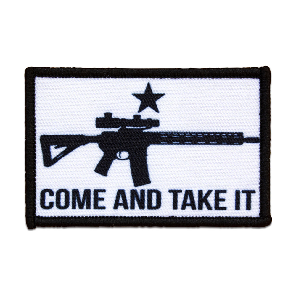 **Features:** - **Size:** 3 x 2 inches (approximate) - **Design:** "Come and Take It" with an AR-15 illustration - **Material:** High-quality embroidered fabric - **Attachment:** Hook and loop backing for easy attachment - **Color:** Multicolored design with bold lettering