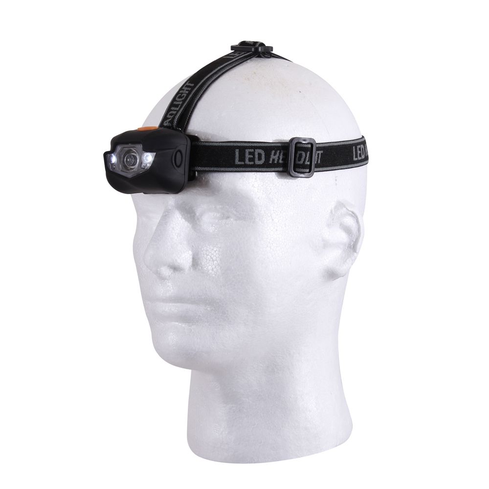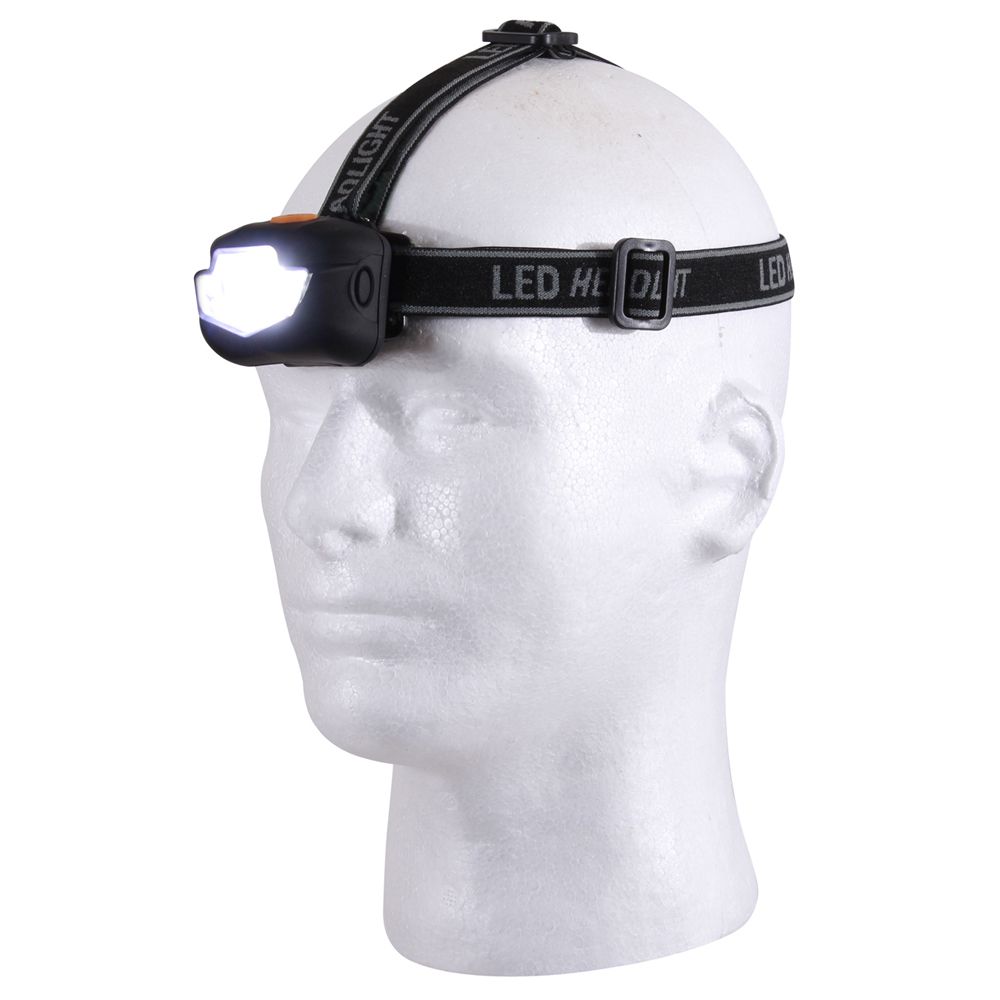 Multi Function 5 Bulb LED Headlamp has 3 stages including a red light stage. Bulbs include a 3 watt cree white center 90 lumens light, 2 white 8 lumens lights, and 2 red 3 lumens lights. The body of the headlamp has an inclination feature and padding on the back. Required 3 AAA batteries; not included.