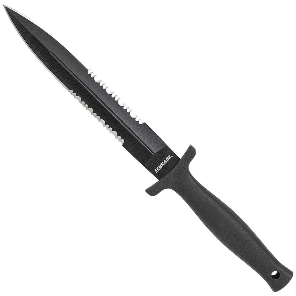 Schrade Boot Knife Fixed Blade, Black 7Cr17MoV High Carbon Stainless Steel Double Edged & Serrated Spear Point Blade with Blood Groove, Black Textured TPE Wrapped Handle with Lanyard Hole, Black Leather Sheath with Boot/Belt Clip.
