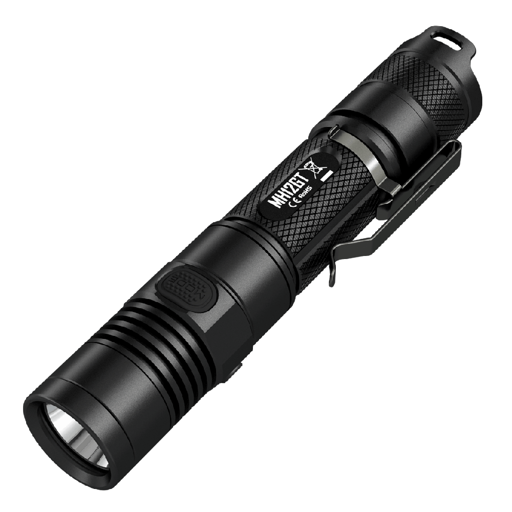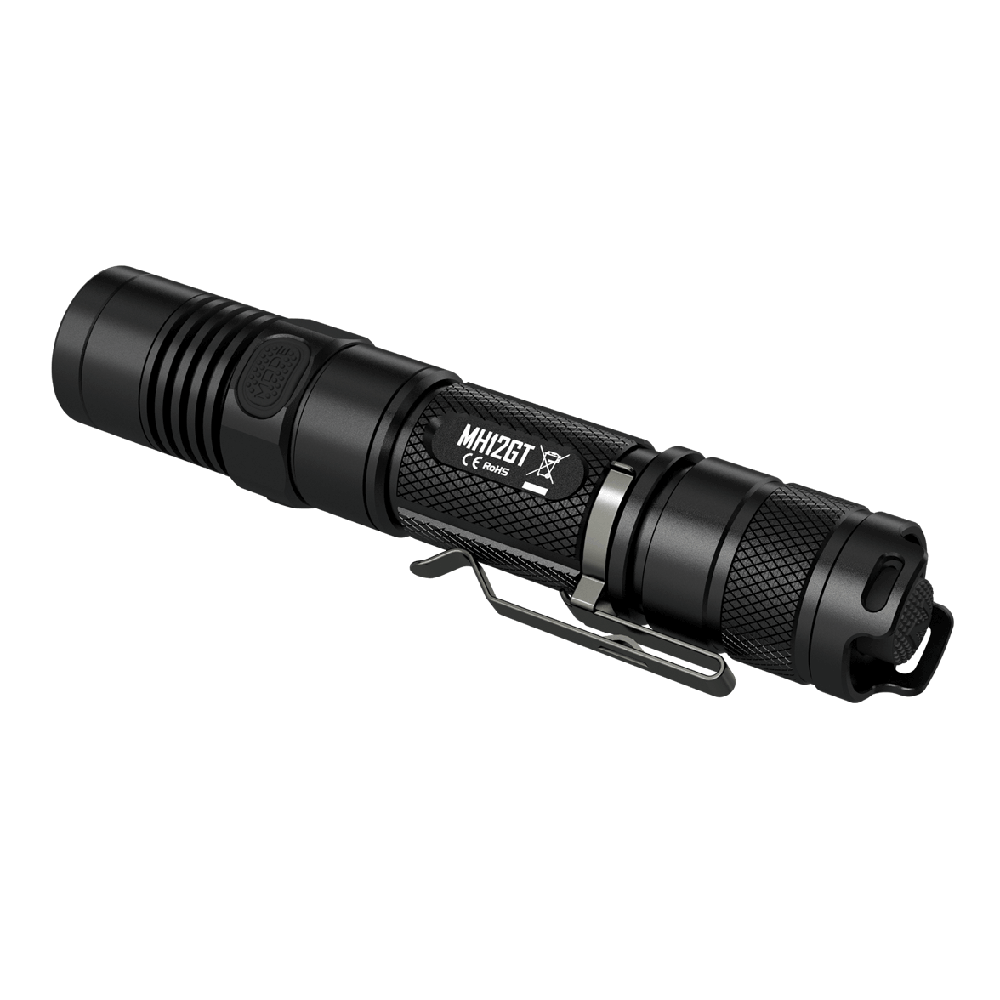The Nitecore MH12GT 1000 Lumen Compact flashlight brings the Grand Throw upgrade to the best-selling MH12. The improved CREE XP-L HI V3 LED offers up to 349 yards throw and a peak beam intensity of 25700cd - a 190% increase from its predecessor! The included 18650 rechargeable battery has also been upgraded to a high capacity 3400mAH cell which can provide up to 520 hours runtime on a single charge. Suited for tactical use, the MH12GT is easily operated via a dual tailcap and side switch user interface. A single tail cap button allows for one-handed operation of on/off functionality while a conveniently located side switch lets users select from four brightness levels and three special modes.