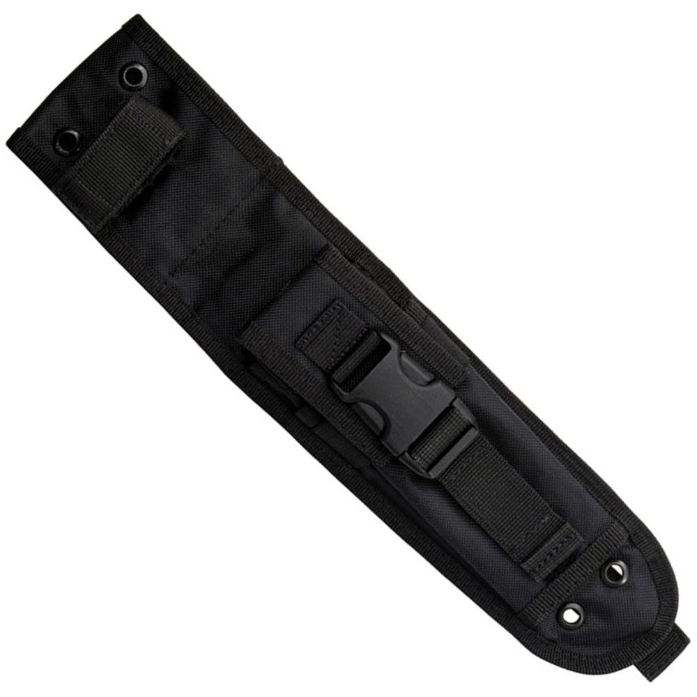 MOLLE compatible black nylon sheath with edge protecting hard plastic insert and roomy utility pouch.