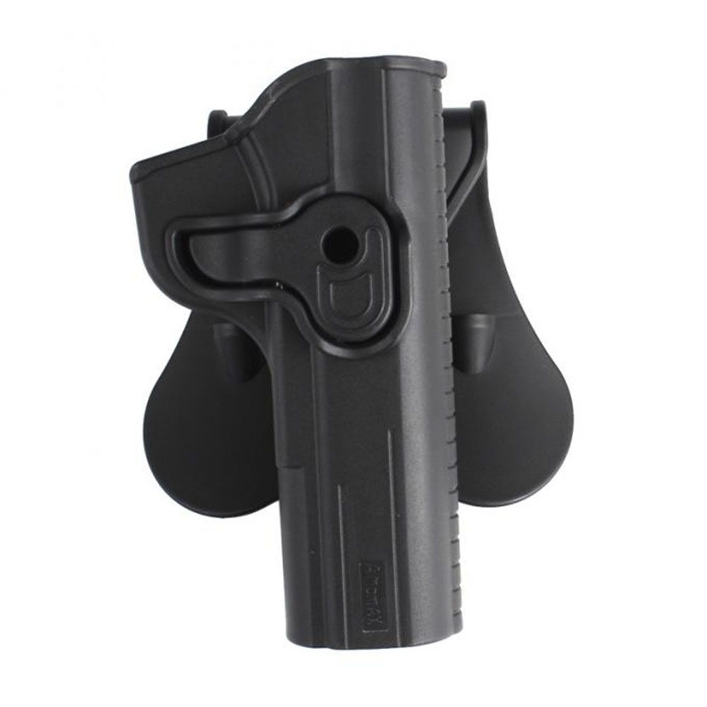 Amomax holster is compatible with 4 different carrying platforms –paddle (standard), belt clip, MOLLE, and drop leg platform. All the carrying platforms can be replaced by only one screw. User can carry them in daily use, outdoor sports, normal shooting training and competition. Holster will stay firmly on belt, leg and MOLLE system even in fast move.Holster body and carrying platform are connected with a tooth gear. The holster body is 360 degrees rotation. User can easily adjust the carrying position.