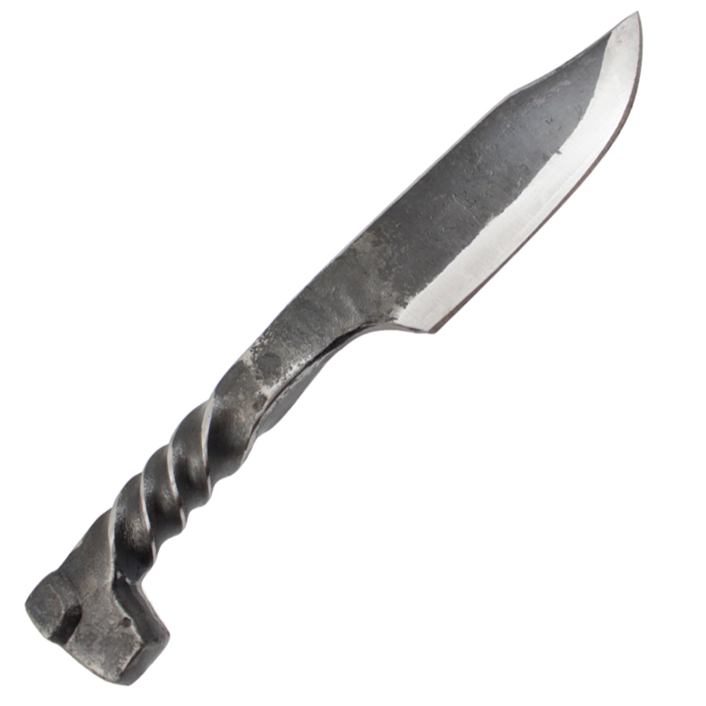 Twisted Railroad Spike Fixed Blade Knife. 9 inch overall. 4.13 inch clip point blade. One piece carbon steel construction. Twisted handle with hammer end pommel. Brown leather belt sheath.