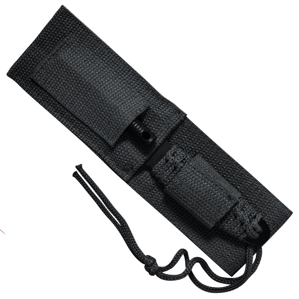 Ultra Force's Paracord Knife With Fire Starter measures 8" total length and features 420 Stainless Steel Black 3.5" Blade, the handle is wrapped with Paracord and durable Polyester Sheath with hook & loop handle Strap. Ultra Force’s survival knife also features a 3 1/8" magnesium fire starter and convenient storage pouch attached to the sheath, which makes the survival knife an essential part of your Bug Out Bag or camping trip.