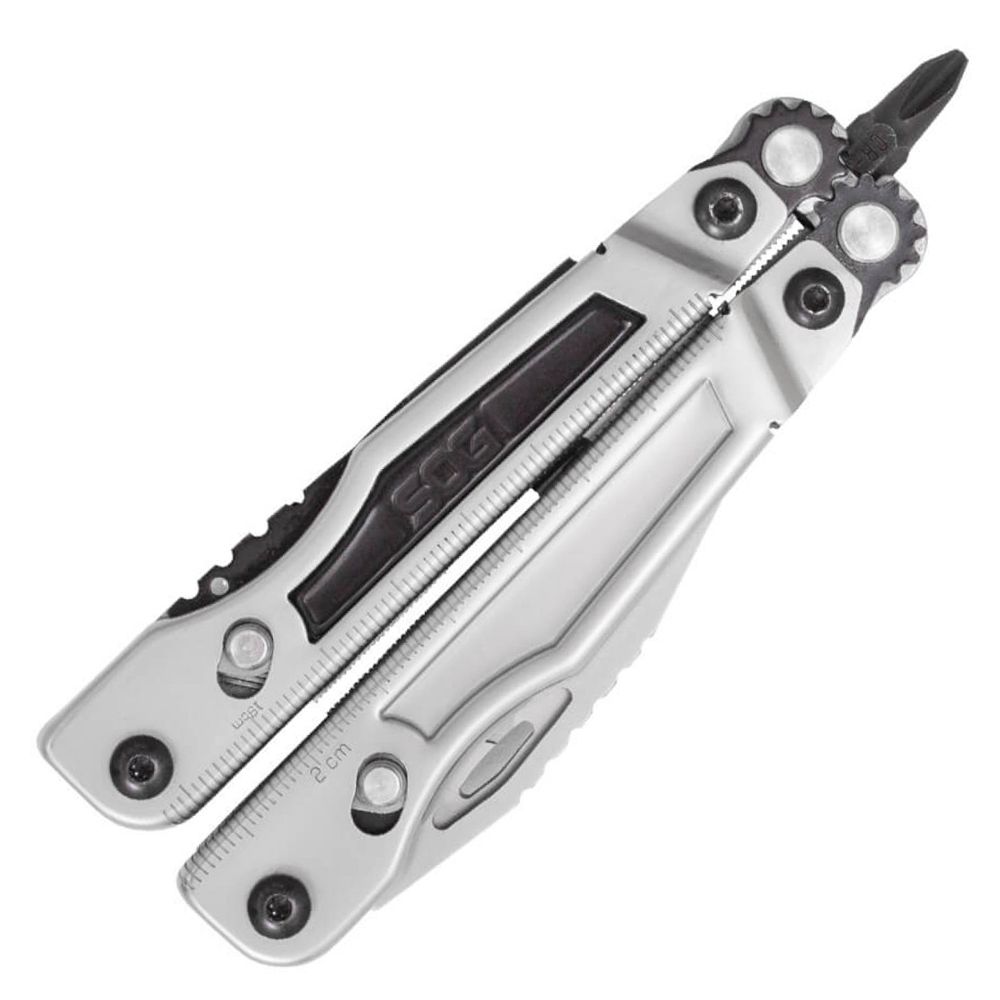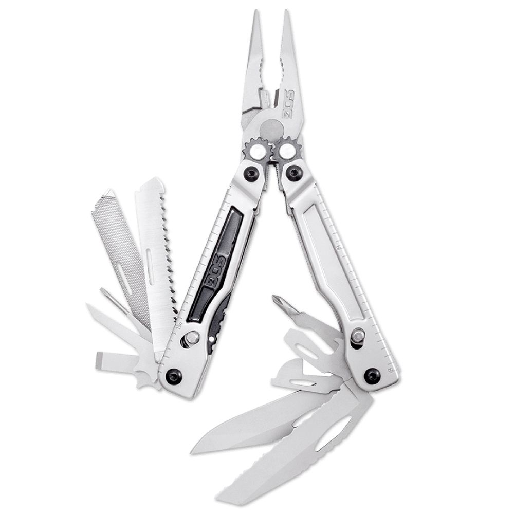 Tools Count: 1. Awl 2. Blade (Fully Serrated) 3. Blade (Straight Edge) 4. Bolt Grip Channel 5. Bottle Opener 6. Can Opener 7. File (3-Sided) 8. Flat Screwdriver (Large) 9. Flat Screwdriver (Medium) 10. Flat Screwdriver (Small) 11. Hex Bit Driver (1/4") 12. Hex Bit Kit 13. Jewelry Driver 14. Needle Nose Pliers 15. Phillips Screwdriver 16. Ruler 17. Wire Crimper 18. Wire Cutter 19. Wood Saw.