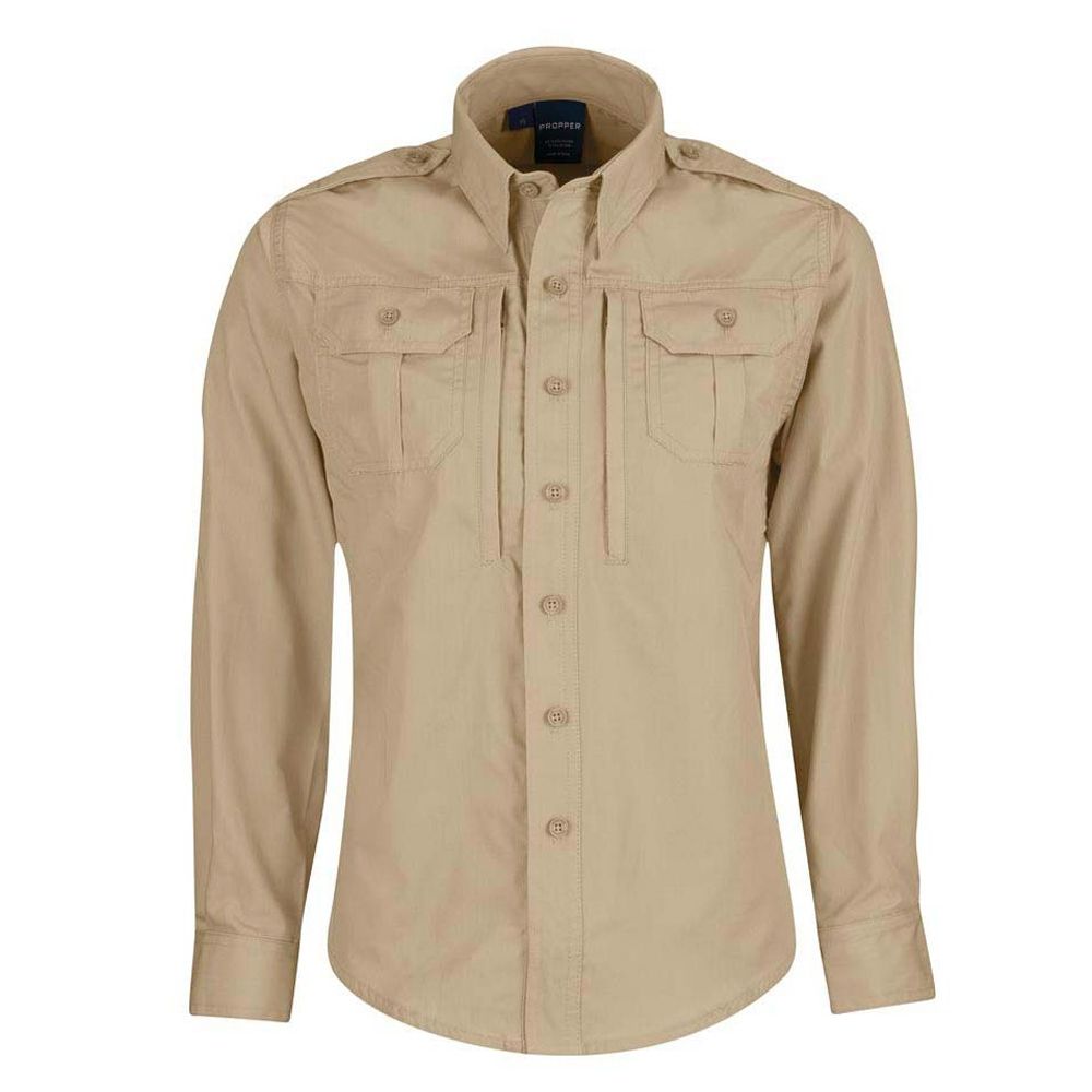 The PROPPER Tactical Shirt is comfortable, durable and professional whether on or off duty. The lightweight, breathable ripstop fabric is fade, shrink and wrinkle resistant, and treated with DuPont Teflon fabric protector to repel stains and liquids. A mock button-up front conceals a hidden zipper for quick access to a vest or weapon. Also features a longer tail in back, two zippered chest pockets, roll-up sleeve tabs and gusseted underarms for a wider range of motion. Pair with our PROPPER tactical pant to create a uniform.