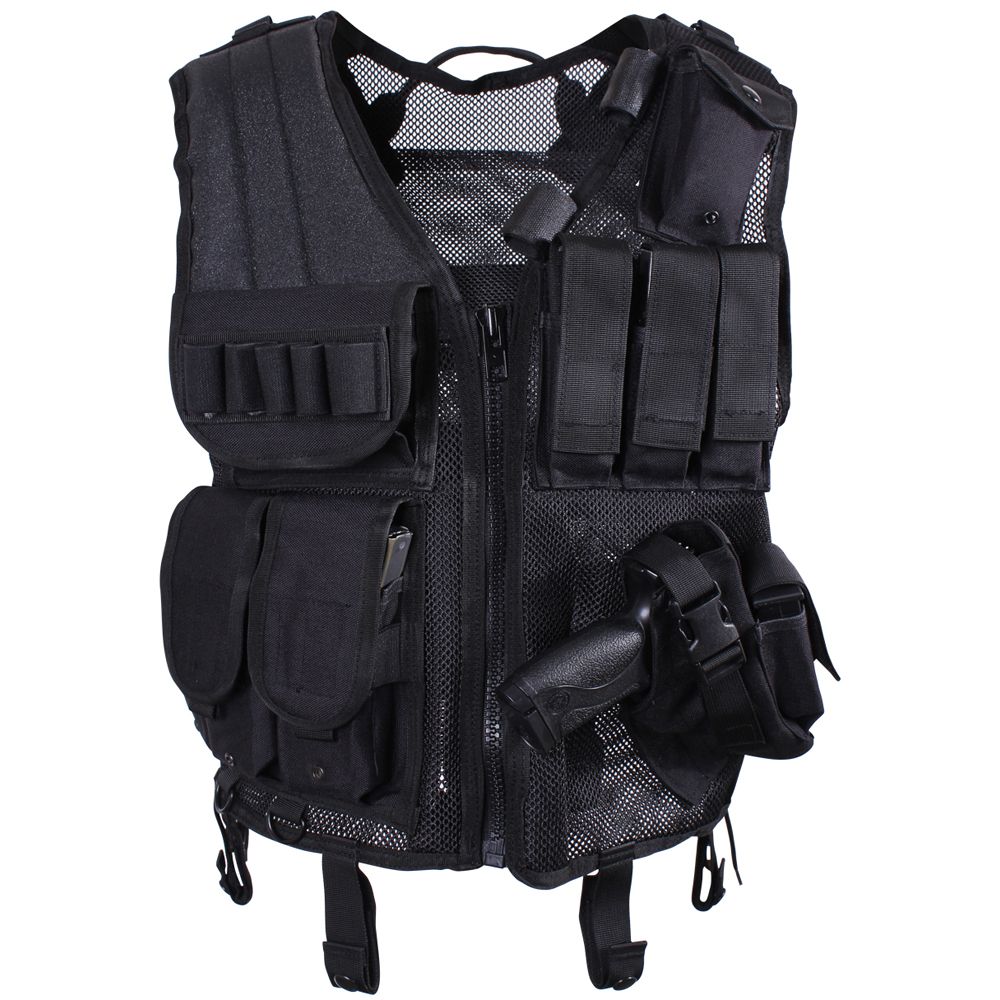 Quick Draw Tactical Vest is a very smart vest which comes with universal pistol holster and 5 shot guns shell loops. It has 3 rifle magazine pouches and a triple pistol magazine pouch too. The hidden pocket spaces for spare cuff keys and many inside pouches for additional storages makes it quite a favorite with military people. It has padded load bearing shoulder straps and padded right shoulder for bracing weapons. The 4 metal d-rings on the bottom of the vest and one on each shoulder give a very dignified look. It also comes with adjustable belt straps.