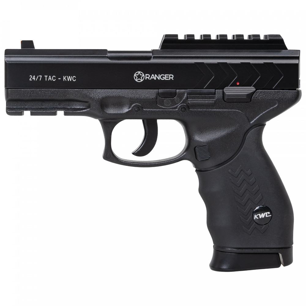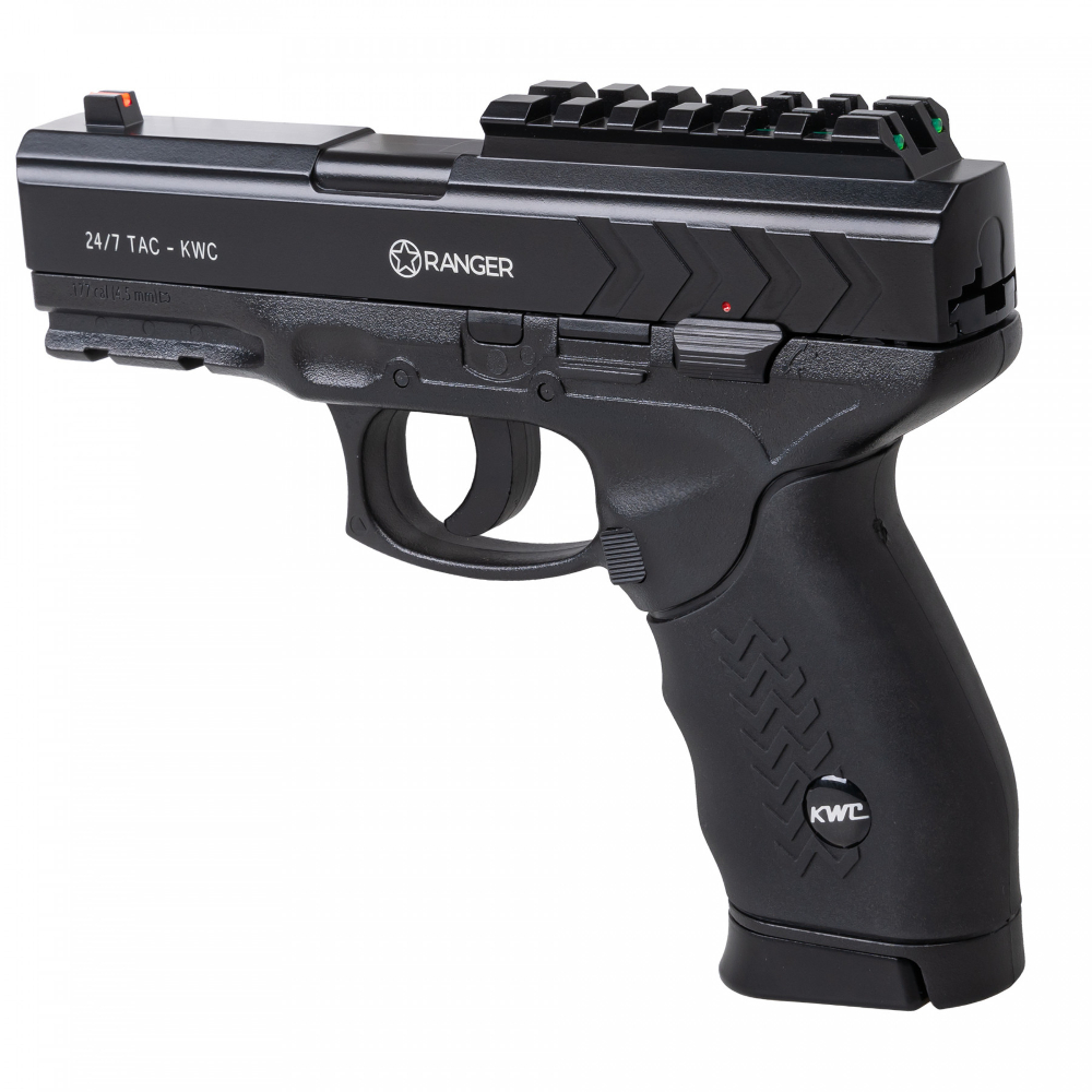 The RANGER 24/7 Diabolo is a very successful and failure-free design pellet pistol. The recognizable distinctive profile, rugged mechanical design and excellent performance make this gun ready for use in all conditions. The skeleton of the pistol and the lock are made of metal, and the body is made of a durable ABS material and weighs as much as 799 g. The entire handle is rubberized, thanks to which the gun lies very well and comfortably in the hand. The whole thing looks very impressive , even for connoisseurs of the real version of this weapon. The magazine of the gun holds as many as 16 shots of Diabolo type (mushroom, flat or point type shots) of 4.5 mm caliber. It has a very innovative design in which we have 2 round magazines with 8 shots in each of them, combined in one rotating block.