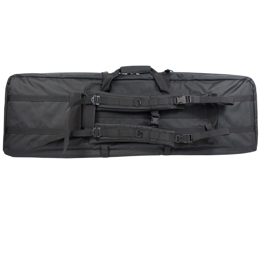 The Raven X combat-ready ultimate double rifle bag is the perfect carrying device and storage for your hunting, simulation war gaming, and training equipment. Constructed of high-quality water/dust resistant material, the double rifle case features a dual-rifle main compartment with integrated padded dividers and hook & loop straps to secure your rifle. This dual-weapon case is fully padded for maximum protection with an additional 26" front compartment for 2 pistols, optics, SMG, or other accessories. It comes with 3 outside pouches that combine to hold up to 14, M4 magazines. Other features include heavy-duty zippers, backpack straps for slick transportation, QD buckles, internal pistol holders, adjustable straps, robust carrying handles, MOLLE webbing, and zippered tool compartment.