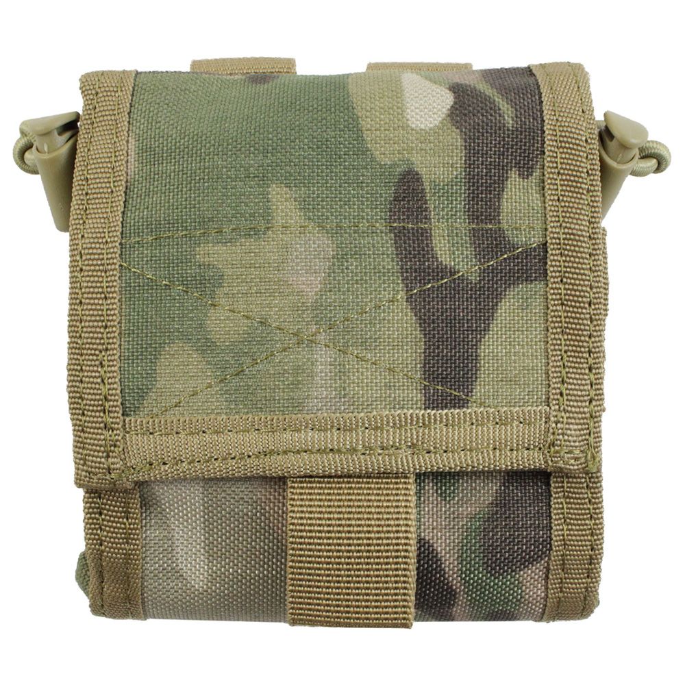 The Raven X MOLLE Roll-Up Dump Pouch can be as large or small as you want it to be. This multi-function utility pouches folds out from a small pocket into a massive dump bag that can hold empty magazines, loose ammo, large water bottles, and a wide range of other field gear. The top can be cinched closed with dual bungee cords and a hook and loop tab. PALS webbing on the back allows for easy attachment to MOLLE compatible vests, bags, and belts. This tactical black model is low-profile and non-reflective.