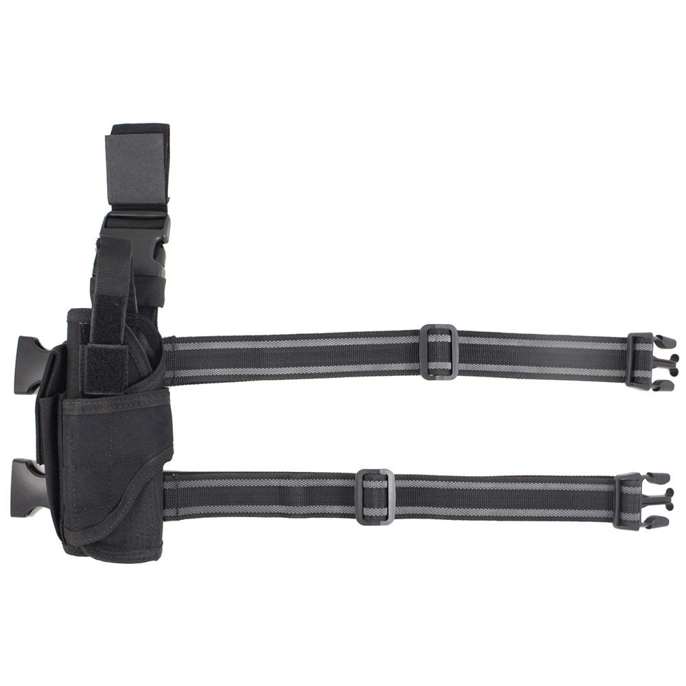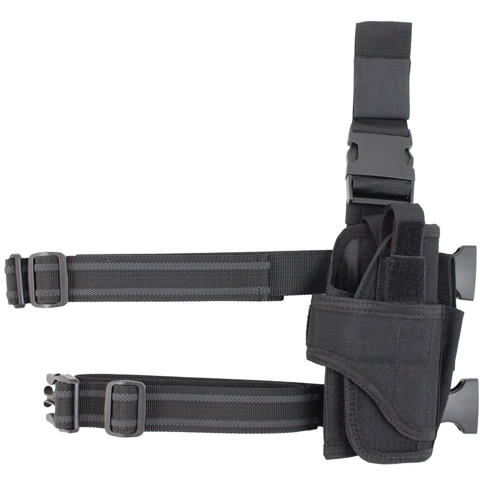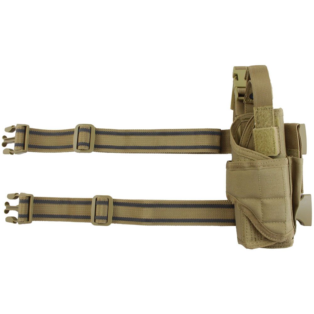 The Raven X Tornado Tactical Left Leg Thigh Holster can fit almost ANY pistol! It easily adjusts to accommodate most models, even ones with tactical lasers or lights. The straps are fully adjustable and feature quick release buckles. A magazine pouch is also included. The hook and loop retention system keeps weapons and ammo secure when not in use. The tan canvas provides camouflage in arid dessert terrain.